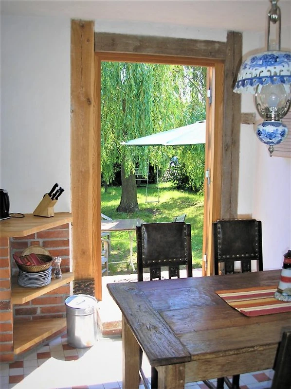 Auch in der Küche mit Blick auf den Garten haben die Vermieter an alles gedacht. Sie ist mit allem nötigen Dingen ausgestattet und so lässt sich der frisch eingekaufte Fisch vom Haff (viele Fischer in Altwarp verkaufen ihren frischen Fang) bestens zubereiten. Gleich schräg gegenüber findet man auch einen kleinen Tante-Emma Laden in dem man nicht nur frische Brötchen bekommt, sondern auch sonst so ziemlich alles.