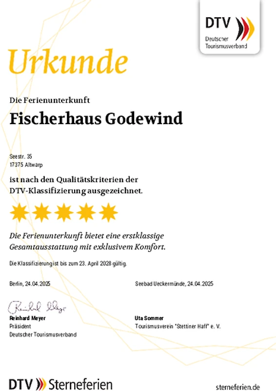 Im kleinen Fischerdorf Altwarp, auf einer Halbinsel gelegen, auf der deutschen Seite des Stettiner Haffs, unweit Ueckermünde, liegt das historische Fischerhaus „Godewind“*****. Es wurde um 1800 erbaut, urgemütliches Fachwerk. Es ist seit 2005 durchgängig mit 5 von 5 Sternen vom Deutschen Tourismusverband klassifiziert. Ein Nichtraucherhaus in einem 650 qm großen Garten, nur ca. 50 m vom Badestrand entfernt.