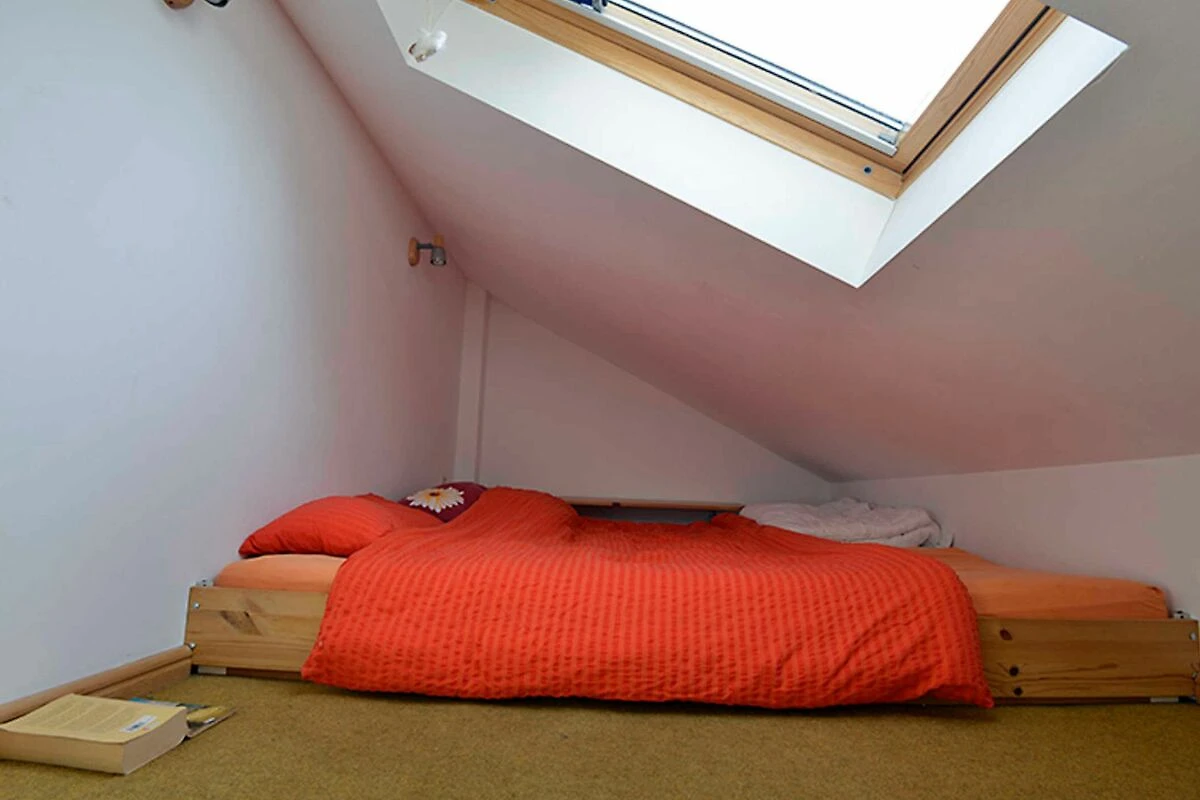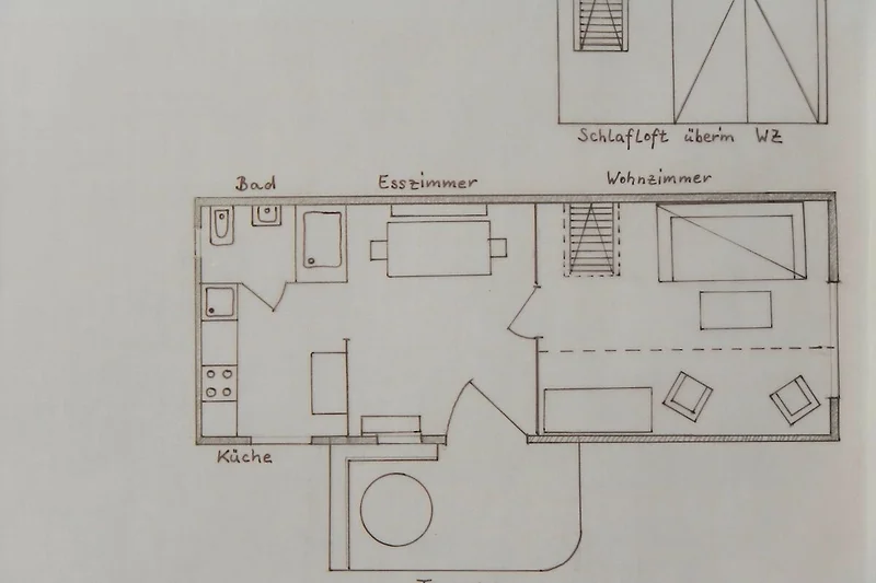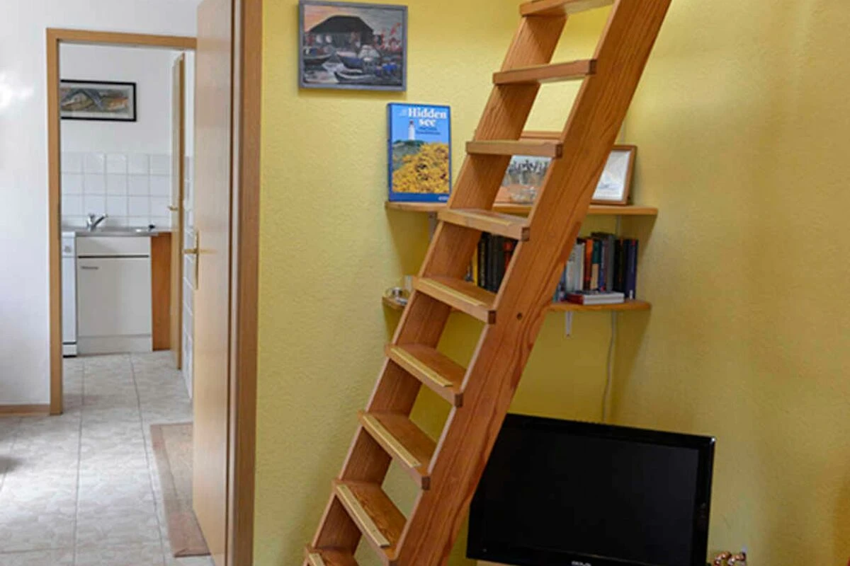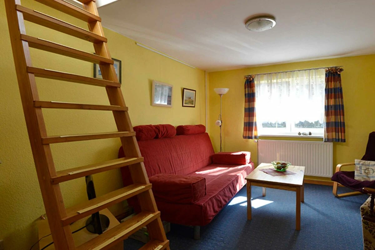 Unsere Ferienwohnung ist eine Nichtraucherwohnung. Auf einer Fläche von ca. 30 m² ist sie für 2-4 Personen ausgestattet. Es gibt kein abgeschlossenes Schlafzimmer, sondern vom Wohnzimmer führt eine Stiege zum Schlafboden, der mit einem Doppelbett und einem Dachfenster ausgestattet ist. Der Durchgang bleibt immer offen. Im Wohnzimmer kann das Sofa zu einem bequemen breiten Doppelbett umgebaut werden. Hier befindet sich ein Fernseher und ein fein gefülltes Bücherregal mit Erwachsenen- und Kinderliteratur.