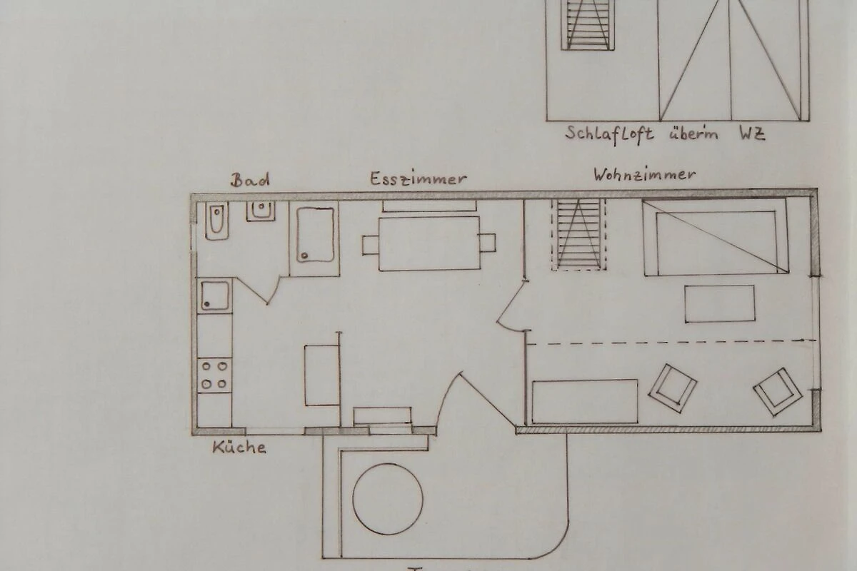 Vom Eingangsbereich nach rechts geht es durch eine Schiebetür ins Wohnzimmer. Das Fenster des Wohnzimmers liegt nach Süden. Der Raum kann auch als Schlafraum genutzt werden, das Sofa ist ausziehbar. Hier steht der Kleiderschrank, ein Fernseher und das Bücherregal. Über eine steile Stiege erreicht man den Schlafboden mit dem Doppelbett. Die Luke ist immer offen, so dass sich die Räume nicht trennen lassen. Oben gibt es ein Dachfenster mit Verdunkelungsrollo und Insektenschutzgitter. Diese beiden Zimmer sind mit Teppichboden ausgelegt.