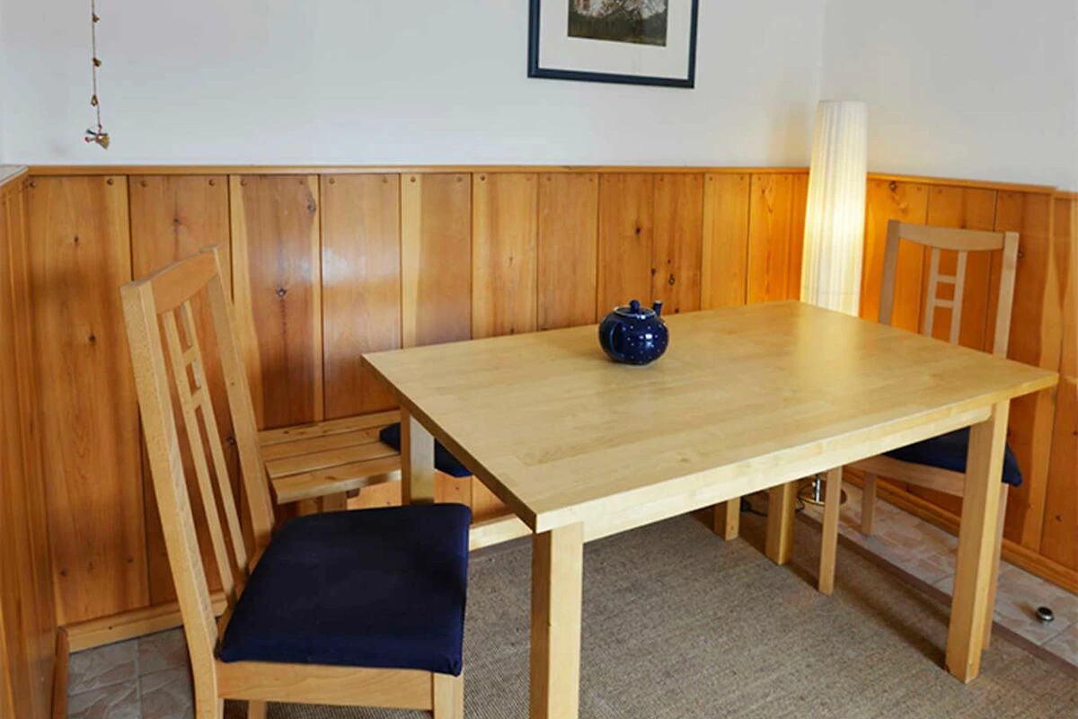 Im Eingangsbereich steht ein Esstisch mit 2 Stühlen und einer Bank. Im Schrank gibt es einige Gesellschaftsspiele.