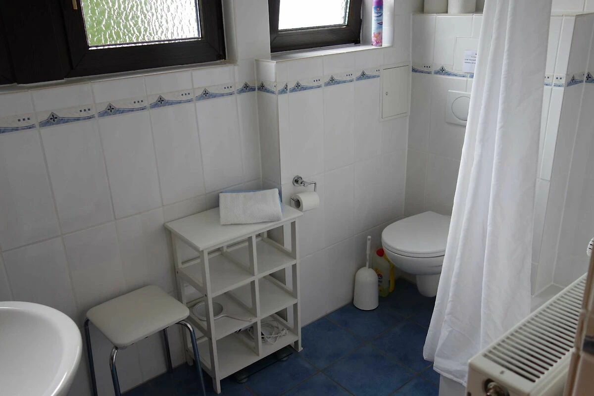 Bad mit Dusche und WC , Waschbecken , Föhn . Allergiefreundlich , voll ausgestattet . Parkplatz.