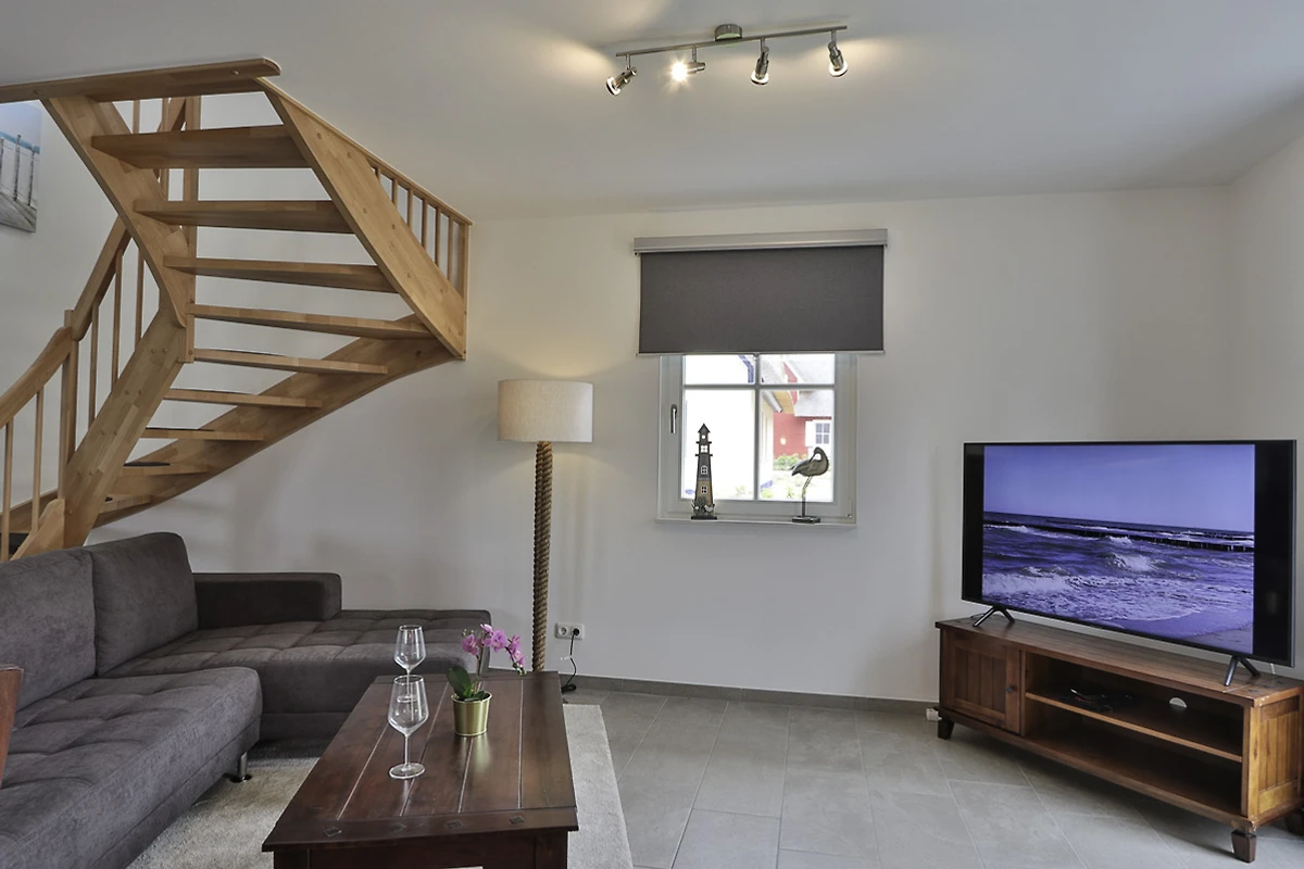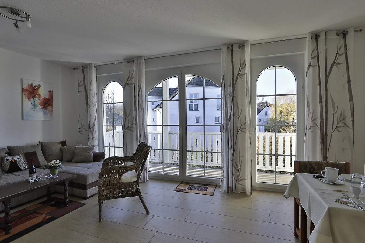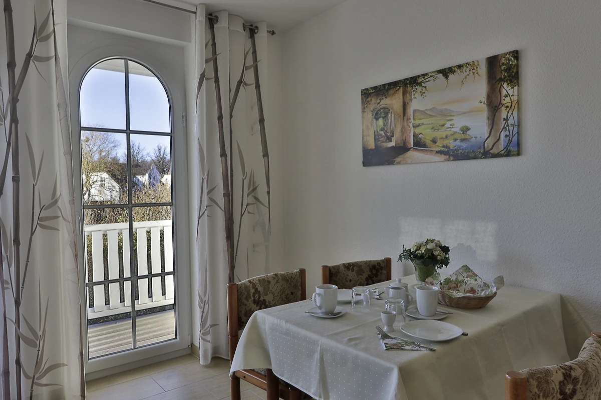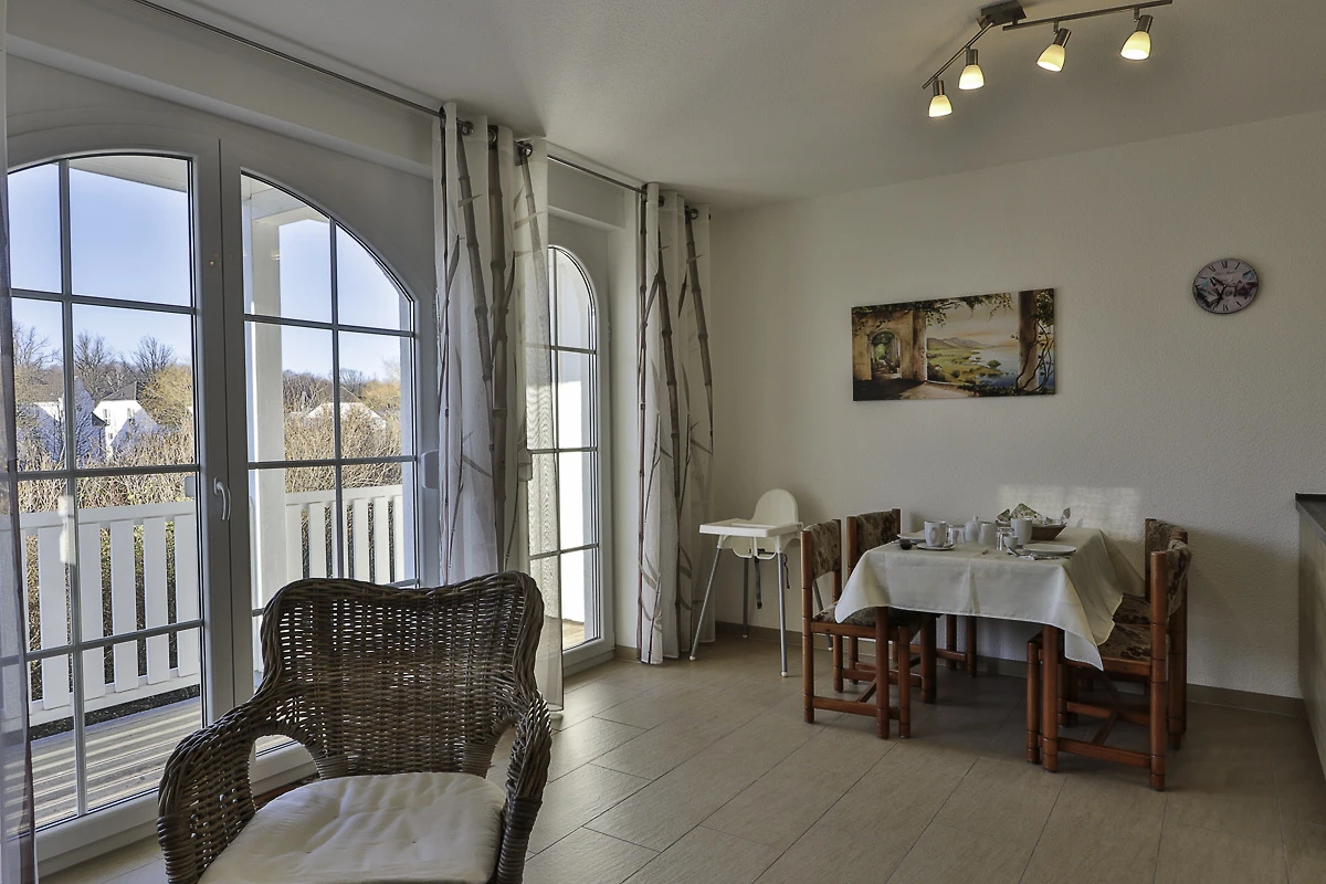 Die Ferienwohnung mit 67qm befindet sich in der Villa " Annette". Die Ferienanlage der "weissen Villen im Bäderstil" liegt 300 m vom schönen Sandstrand entfernt. Die helle und sonnige Wohnung bietet 1 Schlafzimmer mit Doppelbett, 1 Schlafzimmer mit 2 Einzelbetten ( Rollbett) ein geräumiges Wohnzimmer mit Schlafeckcouch und integrierter Küche, ein Duschbad und einen PKW Stellplatz. Vom Wohnzimmer gelangen Sie direkt auf den grosszügigen Balkon. An technischer Ausstattung erwarten Sie DVD-Player, Radio, Sat TV und kostenlose WLAN Nutzung. Die voll ausgestattete Einbauküche verfügt über einen Herd mit Backofen, einen Kühlschrank mit Gefrierfach, eine Kaffeemaschine, einen Toaster, einen Wasserkocher sowie genügend Geschirr und Töpfe. Die Wohnung ist komplett gefliest und mit Fussbodenheizung versehen, alle Fenster haben Aussenjalousien. Kinderbett und -hochstuhl stehen ebenfalls zur Verfügung; für den Balkon Balkonmöbel. Die mitgebrachten oder auch ausgeliehenen Fahrräder können die Gäste im Fahrradabstellraum sicher unterbringen.