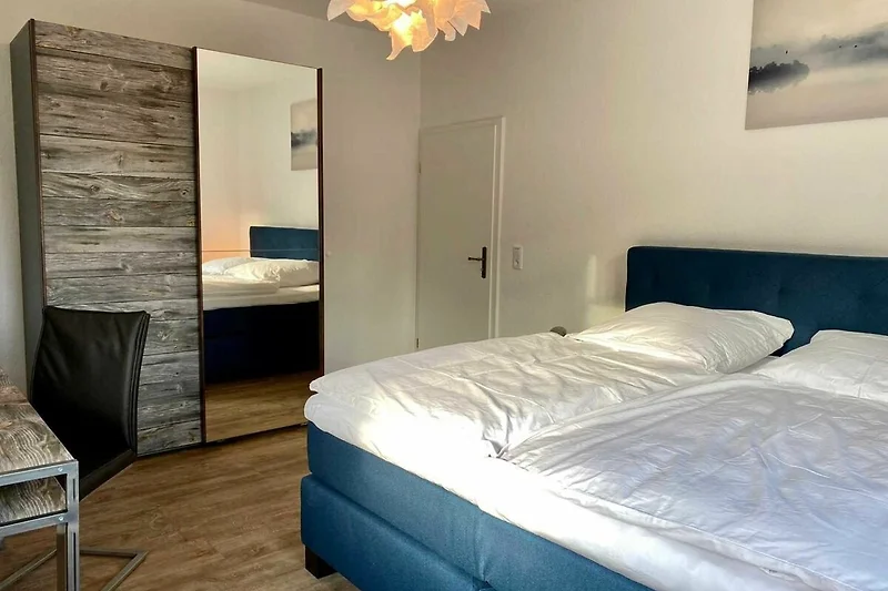 • drei Schlafzimmer mit jeweils einem 2x2m grossen Boxspringbett, mit frisch bezogener Bettwäsche, einem 32 Zoll Flachbildfernseher, einem Schreibtisch mit entsprechender Sitzgelegenheit und einem grossen Kleiderschrank
