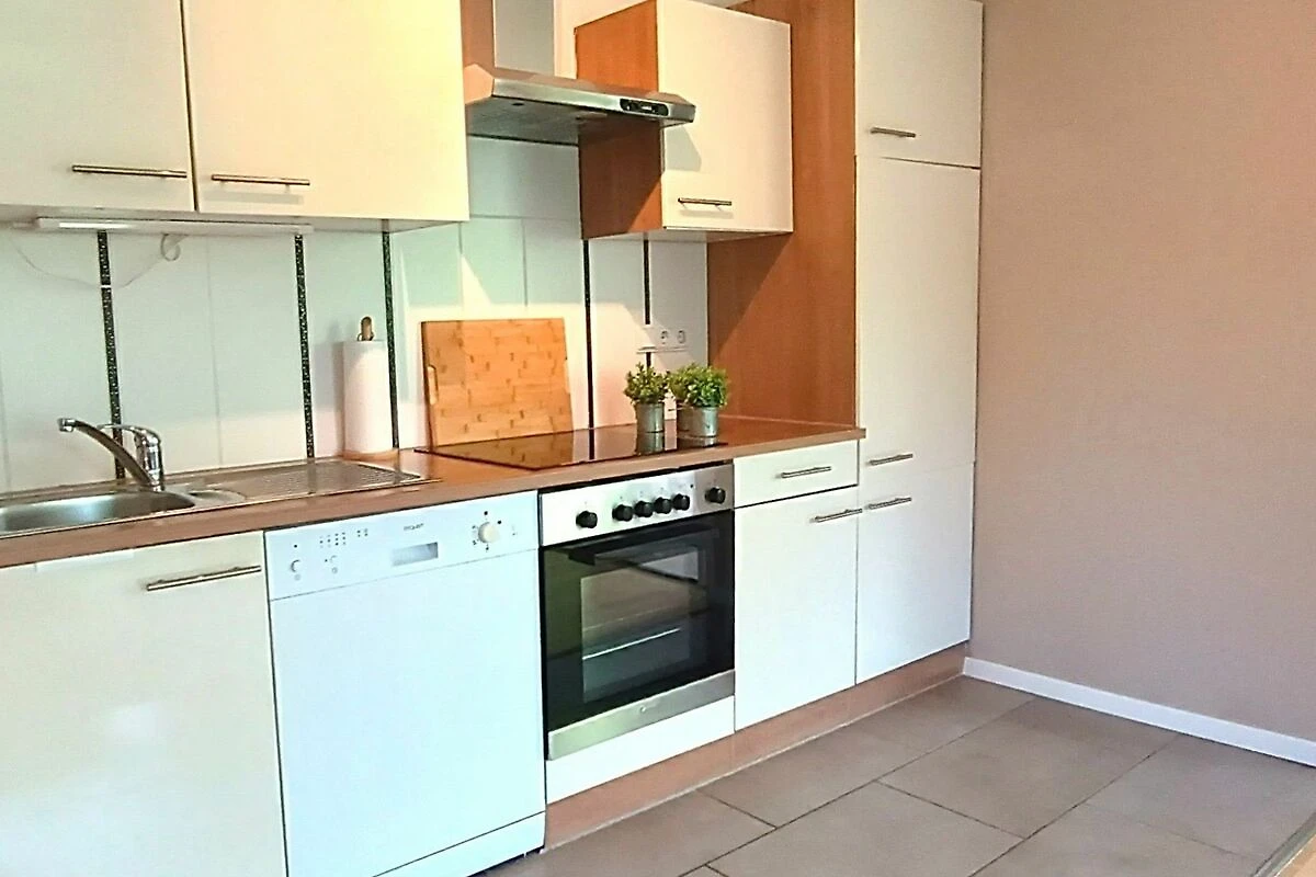 Ruhig gelegene Wohnung mit Wintergarten , Terrasse . Wohnbereich mit Einbauküche , Elektroherd , Spülmaschine , Kühlschrank mit Gefrierfach .