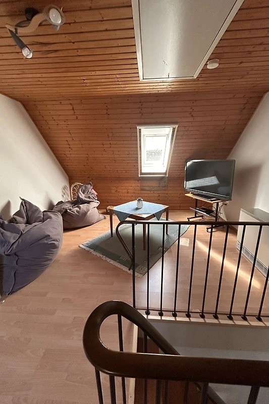 Im 1. Geschoss befindet sich das Kinderzimmer mit 2 einzelnen Betten, das Schlafzimmer mit einem Ehebett, sowie das Badezimmer mit Toilette und Dusche. Auf dem Dachboden ist ein weiteres Bett und eine gemütliche Sitzecke mit einem weiteren Fernseher.