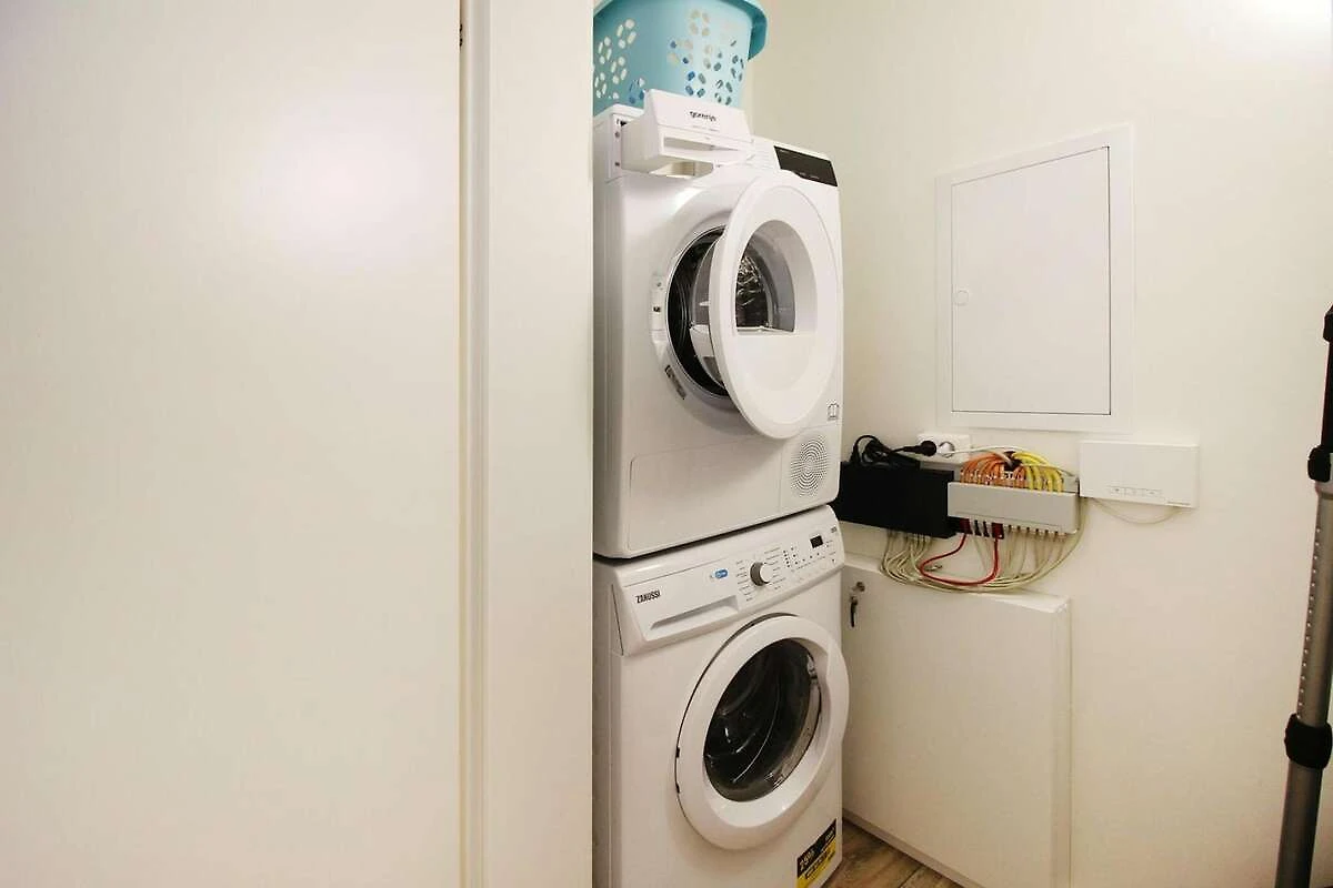 Parterre: (offene Küche(Wasserkocher, Toaster, Kaffeemaschine, Backofen, Mikrowelle, Spülmaschine, Kühl-/Gefrierkombination), Wohn/Esszimmer(TV, Esstisch, Kaminofen), Schlafzimmer(Einzelbett, Einzelunterschiebebett), Badezimmer(Dusche, Waschbecken, Toilette, Waschmaschine))