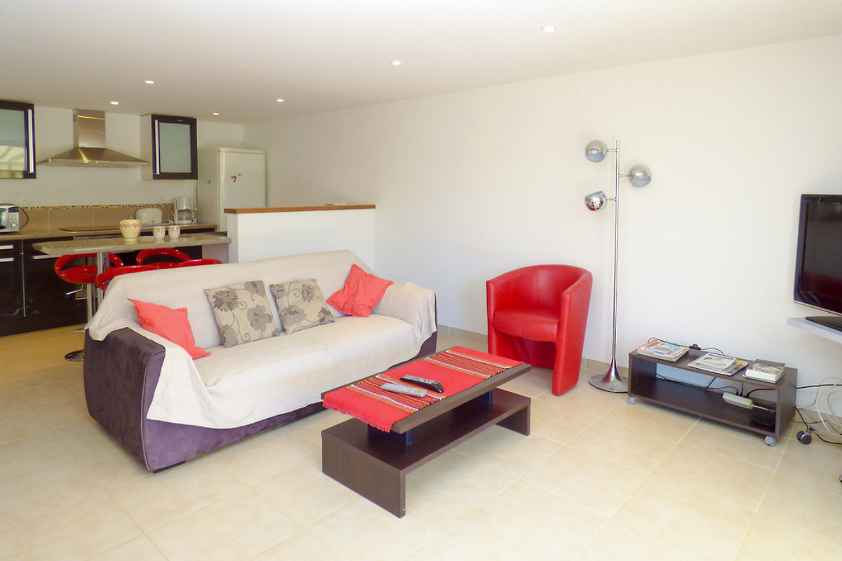 Villa mit einem Wohnzimmer mit Tisch und Sesseln für 6 Personen