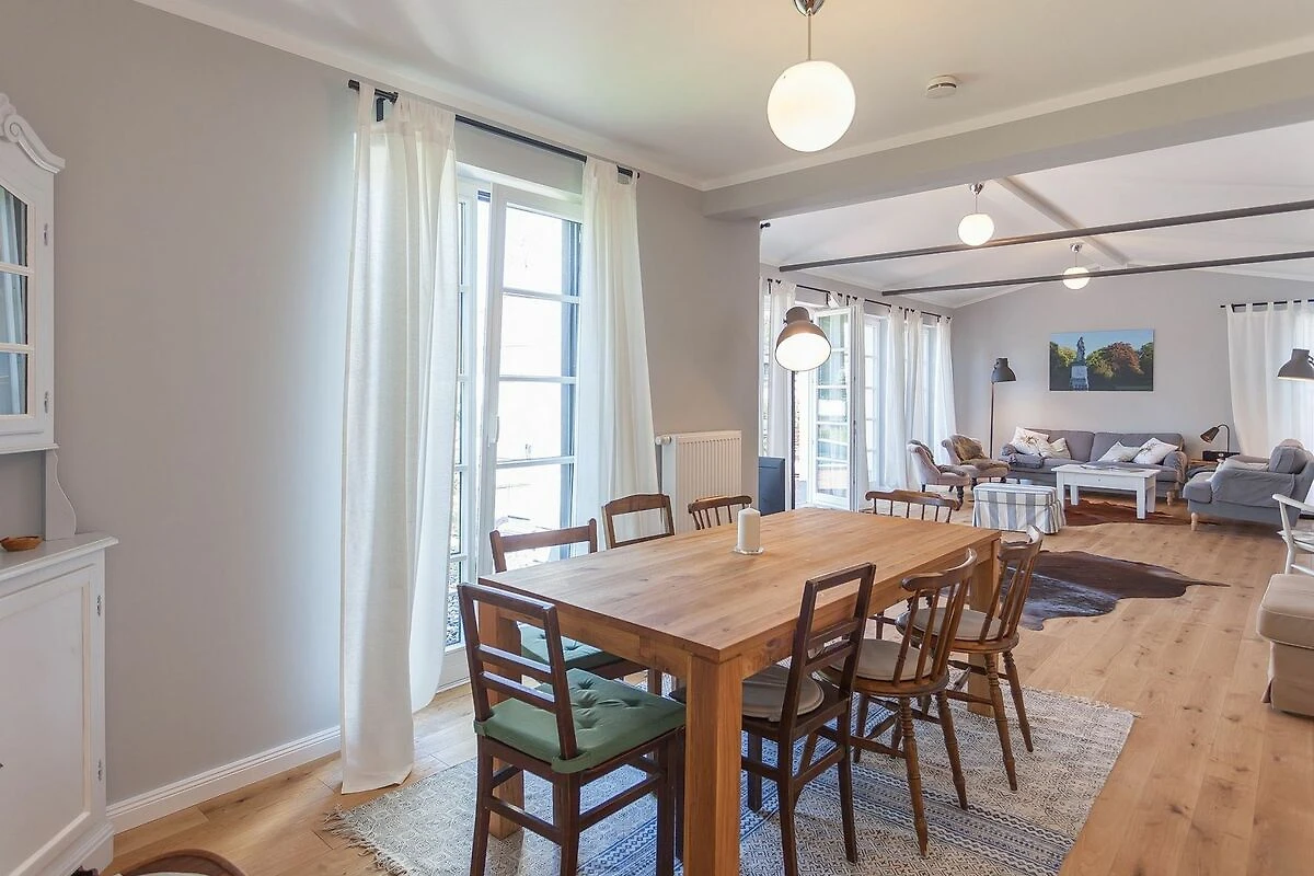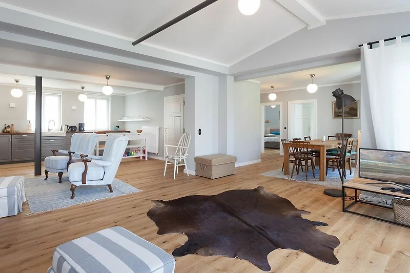 Auf drei Etagen und rund 210 qm Wohn- und Nutzfläche verfügt das Haus über drei Schlafzimmer mit Doppelbetten (eines davon mit en-suite-Bad), drei zusätzliche Duschbäder mit WC, einen geräumigen Koch-, Wohn- und Essbereich im Erdgeschoss und einen gemütlich ausgebauten Dachboden, in dem noch drei Einzelbetten, die jeweils zum Doppelbett ausgezogen werden können, stehen. Maximal 12 Personen finden hier also ein schönes Urlaubsdomizil auf Zeit.