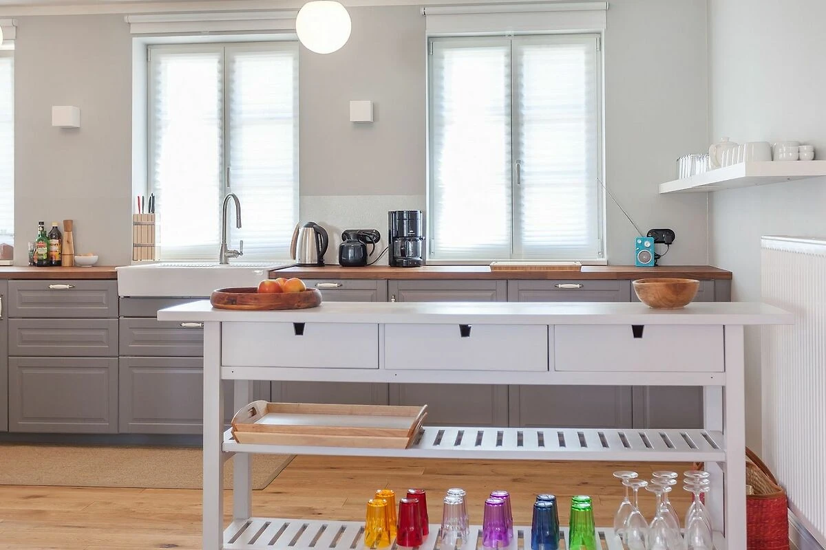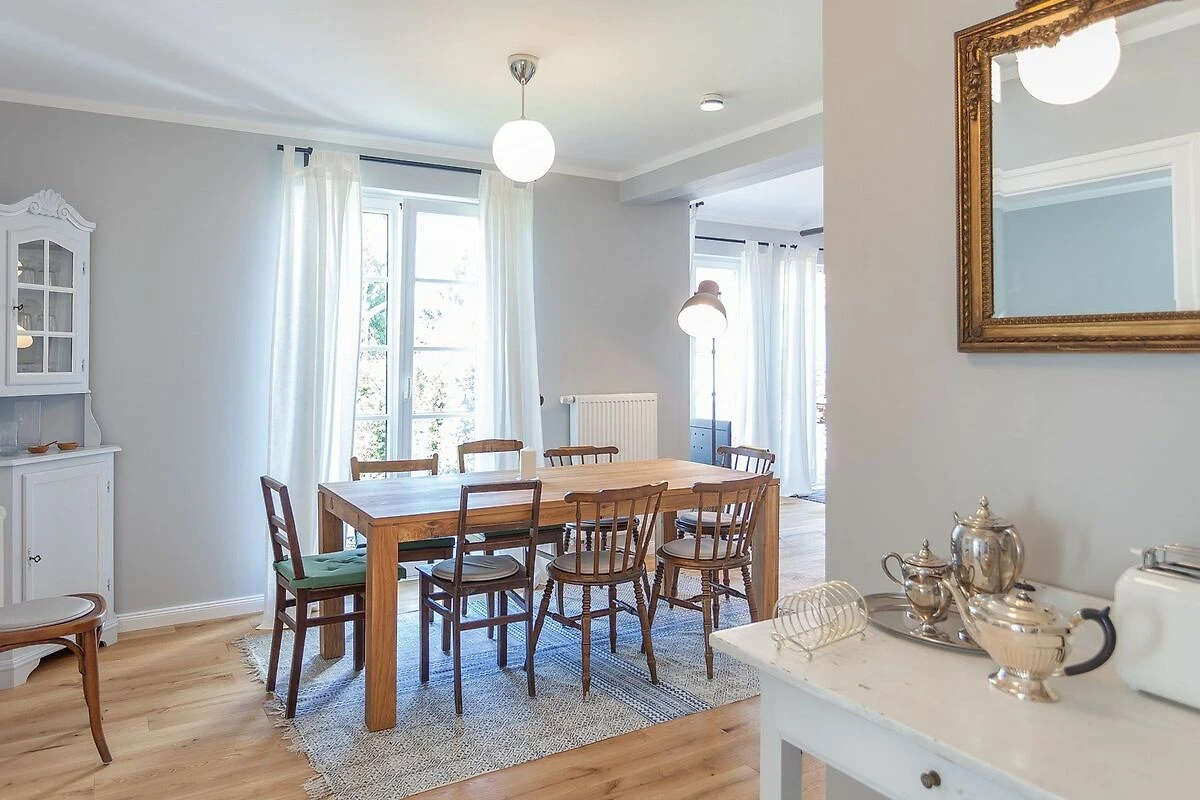 Zur Ausstattung des Ferienhauses gehören selbstverständlich auch kostenfreies W-LAN und Stellplätze für bis zu drei PKW in der Einfahrt. Bettwäsche und Handtücher können wahlweise selbst mitgebracht oder über die RÜGEN-DOMIZILE dazu gebucht werden. Im Hauswirtschaftsraum gibt es u.a. einen Staubsauger und eine Waschmaschine.