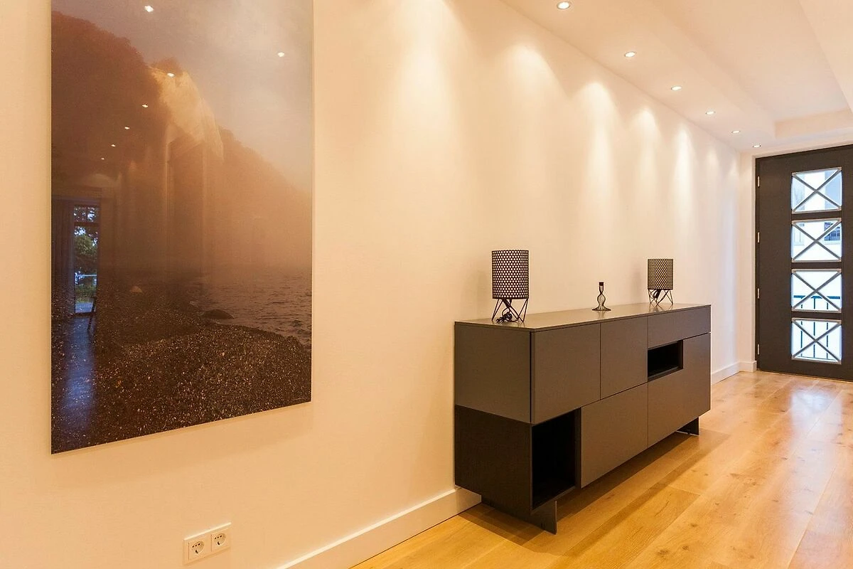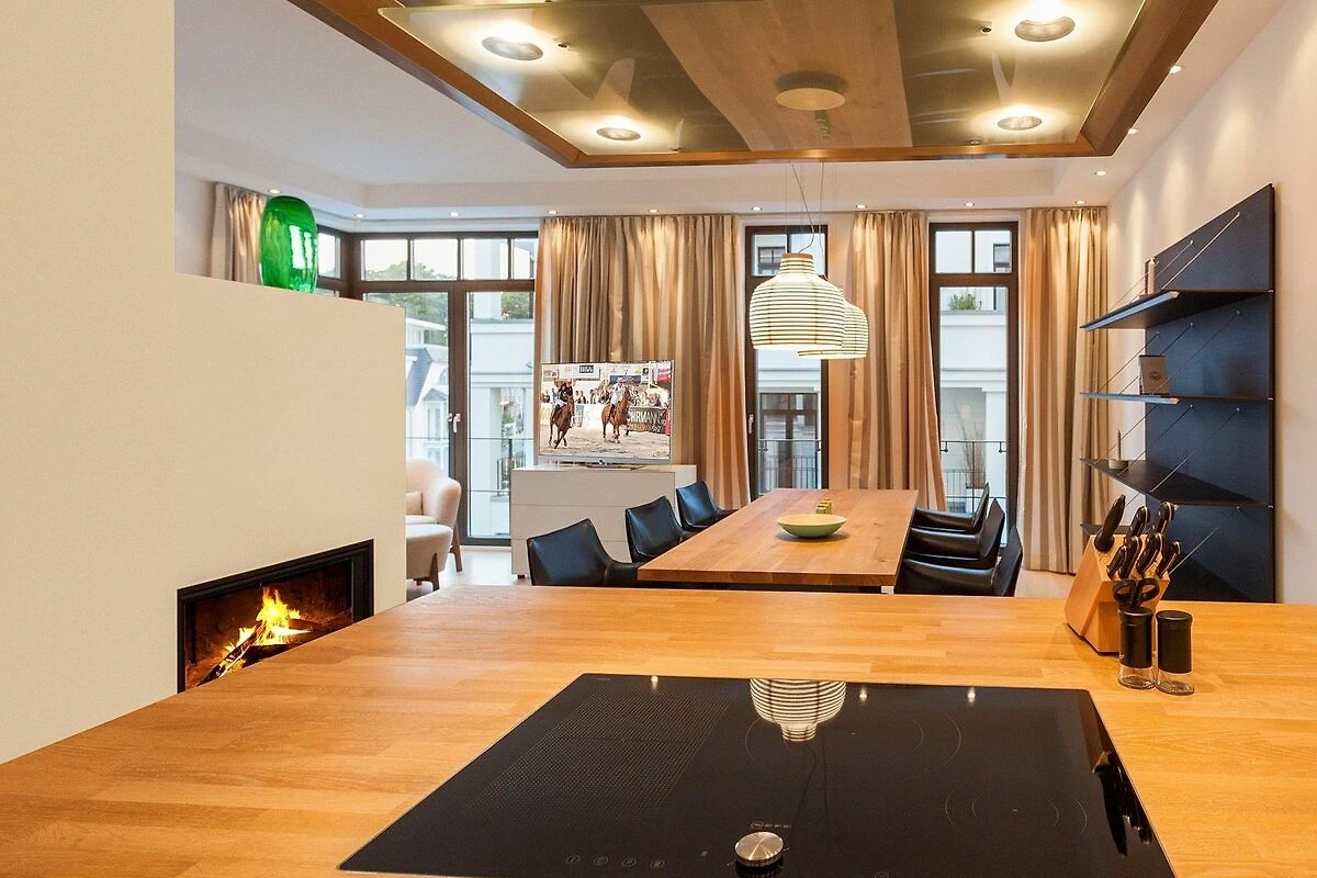Über eine beeindruckende Eichentreppe welche die beiden Etagen der Strandresidenz verbindet gelangen Sie[nbsp] in den lichtdurchfluteten[nbsp] 70 qm grossen Wohn- und[nbsp] Kochbereich mit einem eleganten Küchenblock inkl. neuestem Kaffeevollautomat der Siemens EQ Serie, einem Esstisch für alle Gäste und einem Tunnelkamin als Raumteiler.