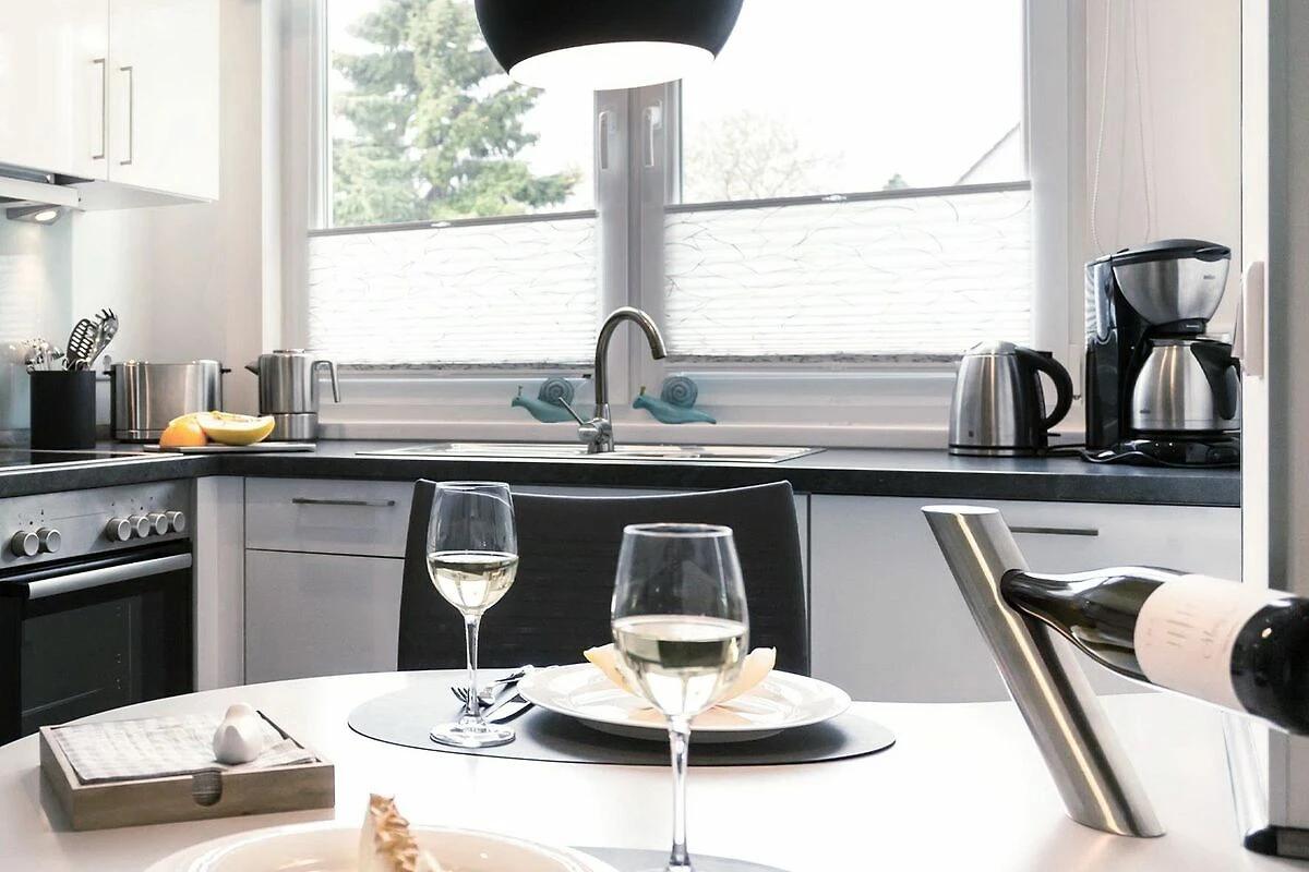 Die Ferienwohnung „Einkehr“**** ist ein modernes und liebevoll ausgestattetes Urlaubsdomizil. 2 Erwachsene und 1 Kind bzw. Jugendlicher finden in den lichtdurchfluteten Räumlichkeiten mit Terrasse in Süd-Westausrichtung inklusive Gartennutzung Platz. Es erwarten Sie sämtliche Annehmlichkeiten, angefangen von Rolläden zur Beschattung und Verdunkelung über Fussbodenheizung und Echtholzparkett bis hin zu einem hochwertigen Duschbad inkl. Bidet. Für die kleinsten Gäste stehen nach vorheriger Anmeldung ein Kinderreisebett und ein Hochstuhl kostenfrei zur Verfügung. Die komfortable Einbauküche bietet, genau wie die anderen ausgesuchten Ausstattungsgegenstände, beispielsweise das Funktionssofa von Brühl oder Möbel von Hülsta, ein besonders behagliches Ambiente mit hohem Wohnkomfort.