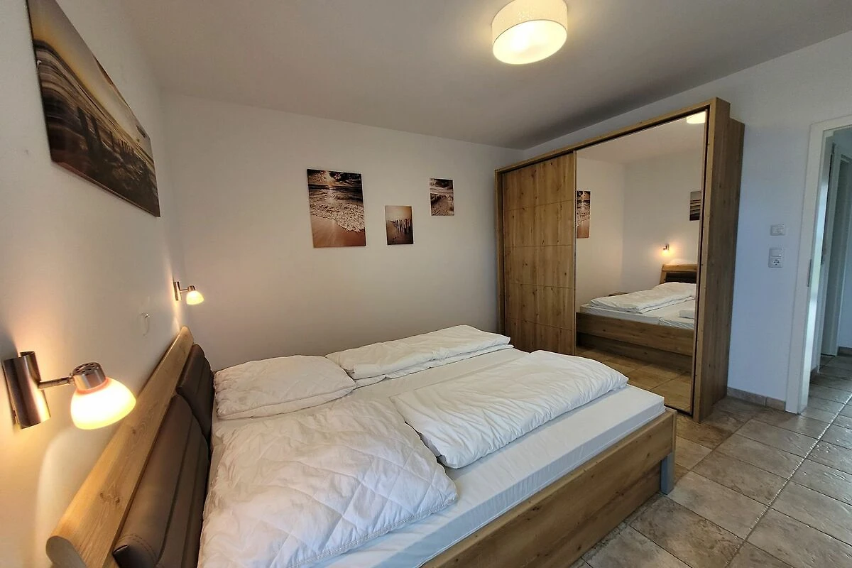 Das Wohnzimmer mit grosser (Schlaf-)Couch, Flat-TV und gemütlichem Essbereich lädt zum Kochen und Verweilen ein. Die integrierte Einbauküche ist mit Geschirrspüler, Vier-Platten-Herd (kein Backofen), Dunstabzugshaube, Kühlschrank mit Gefrierfach, Kaffeemaschine, Eierkocher, Wasserkocher, Toaster und Mikrowelle ausgestattet. So lässt es sich gut gesättigt in den Tag/Abend starten. Das grössere Schlafzimmer empfängt Sie mit einem Doppelbett (180 x 200 cm / getrennte Matratzen) und einem geräumigen Kleiderschrank für Ihr Gepäck. Das kleinere Schlafzimmer besitzt ein Doppelbett mit den Massen 140 x 200 cm und weiteren Stauraum. Die Wohnung ist mit Fussbodenheizung ausgerüstet. Zudem befindet sich im Duschbad ein separater Handtuchtrockner. Vom Wohnbereich aus gelangen Sie auf die Terrasse. Mit den vorhandenen Balkonmöbeln lässt es sich hier ebenfalls gut frühstücken.