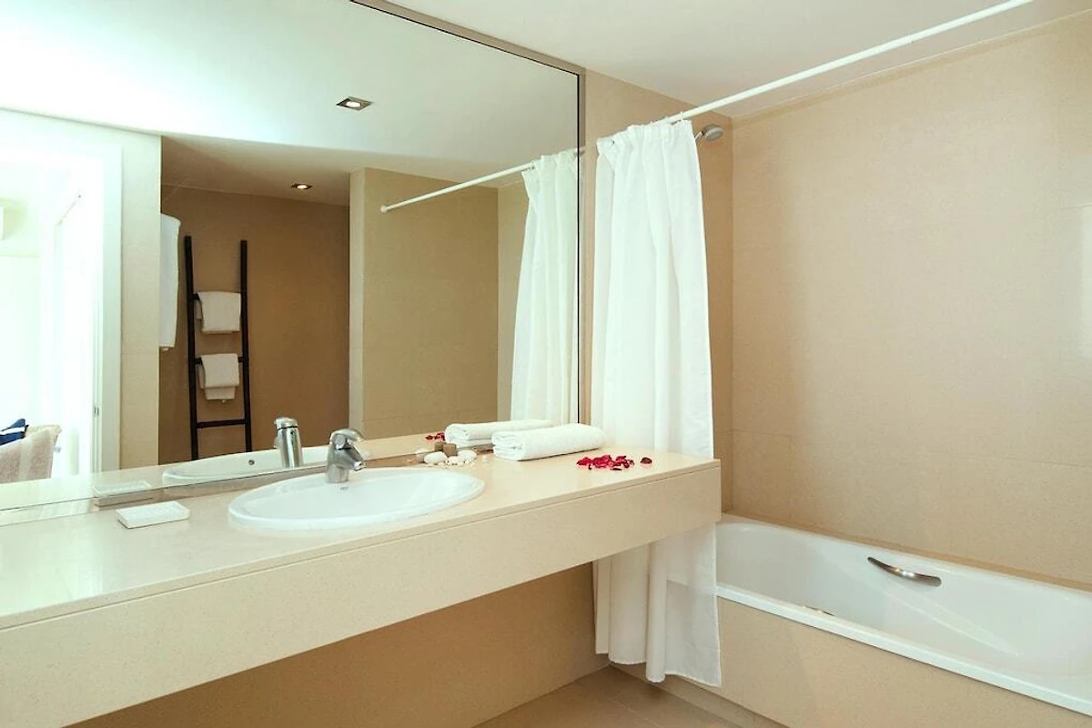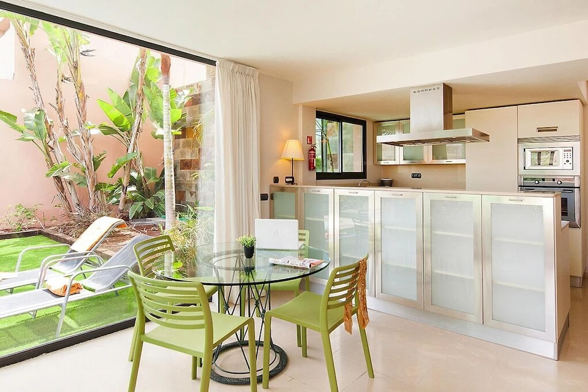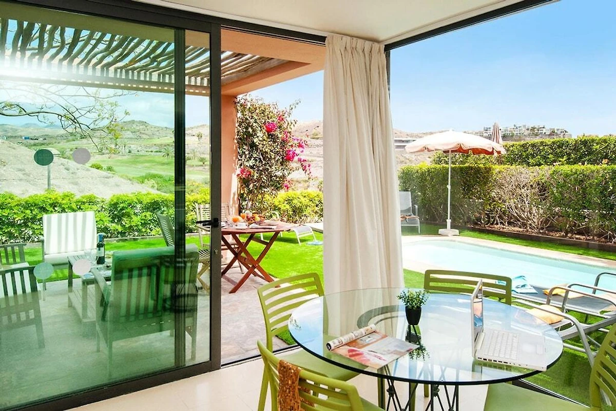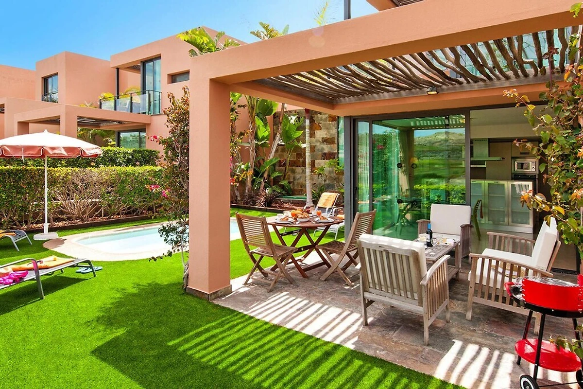 Ferienvilla mit Außenpool und heller, moderner Bauweise mit offenem Wohnbereich. Bodenlange Panoramafenster lassen viel Licht ins Haus und bieten Ihnen einen herrlichen Blick auf die Umgebung. Wer möchte da nicht mit einem guten Buch und einer Tasse Kaffee auf der Terrasse entspannen und sich zwischendurch einfach im Pool erfrischen? Golfer können während ihres Urlaubs ihr Handicap verbessern, denn die Villa befindet sich direkt am Golfplatz und als Villen-Gast erhalten Sie Greenfee-Ermäßigung. Der Golfplatz Süd (18-Loch) hat auf einer Lauflänge von 6.112 Meter ein Par von 71 Schlägen, der Golfplatz Nord (18-Loch) verfügt über eine Lauflänge von 5.524 Meter und hat ein Par von 72 Schlägen.