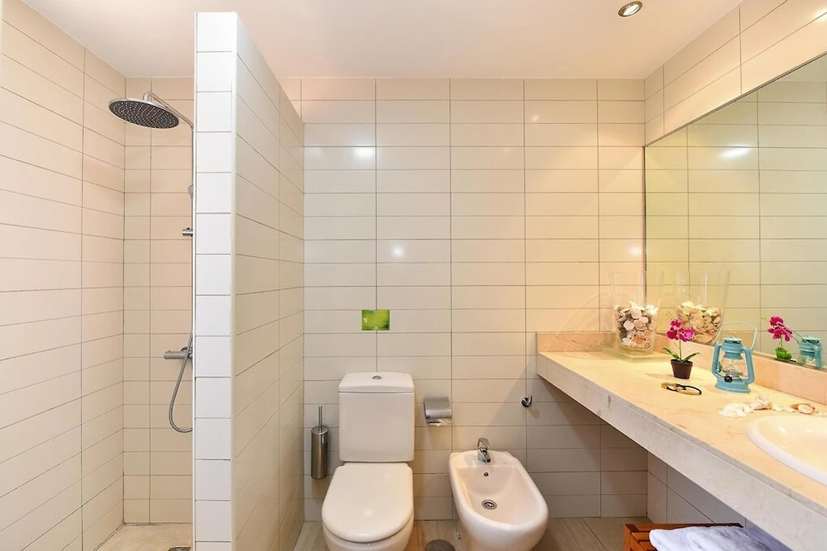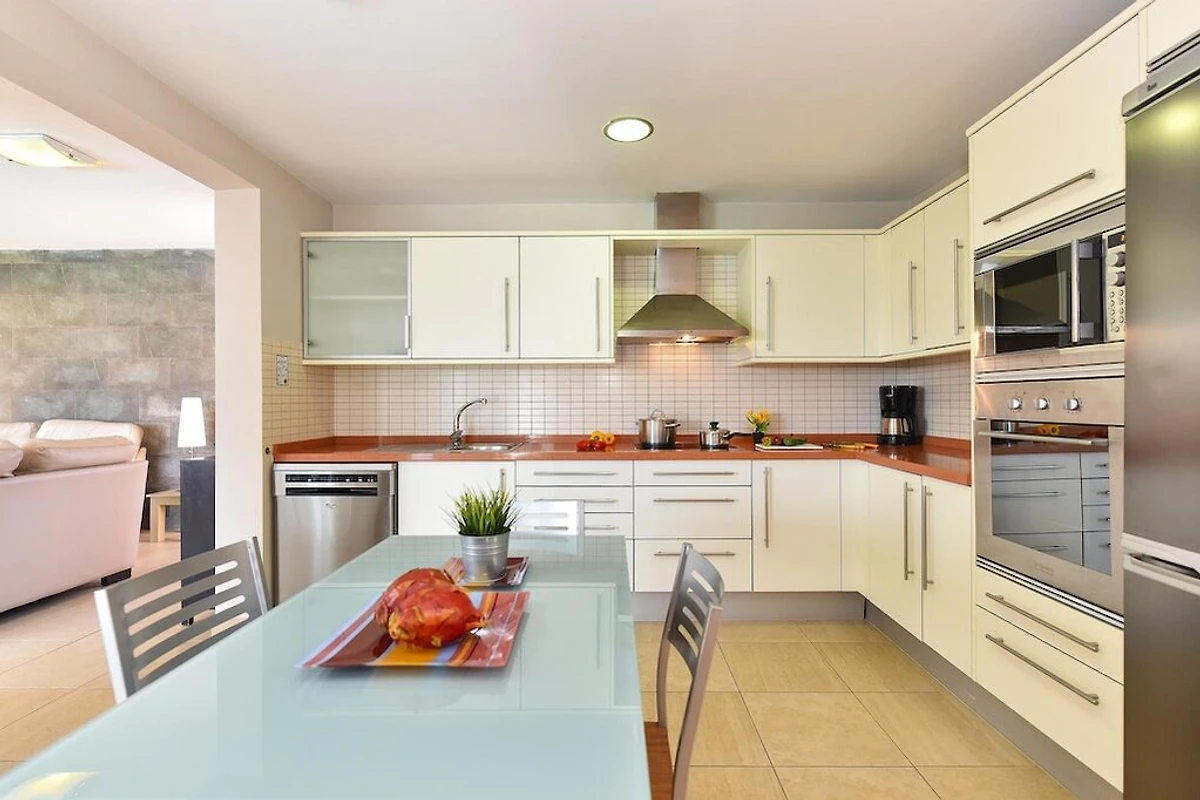 Wohnzimmer(TV(Kabel, Satellit), DVD-Spieler), offene Küche(Herd, Wasserkocher, Toaster, Kaffeemaschine, Backofen, Grill, Mikrowelle, Spülmaschine, Kühl-/Gefrierkombination), Schlafzimmer(Einzelbett, Einzelbett), Schlafzimmer mit Badezimmer(Doppelbett, Dusche, Toilette, Bidet), Badezimmer(Dusche, Toilette), Esstisch, Waschmaschine, Klimaanlage, Dachterasse, Gartenmöbel, Parkplatz, Pool(alleinige Nutzung, im Garten, beheizbar), Hochstuhl, Babybett (kostenlos)