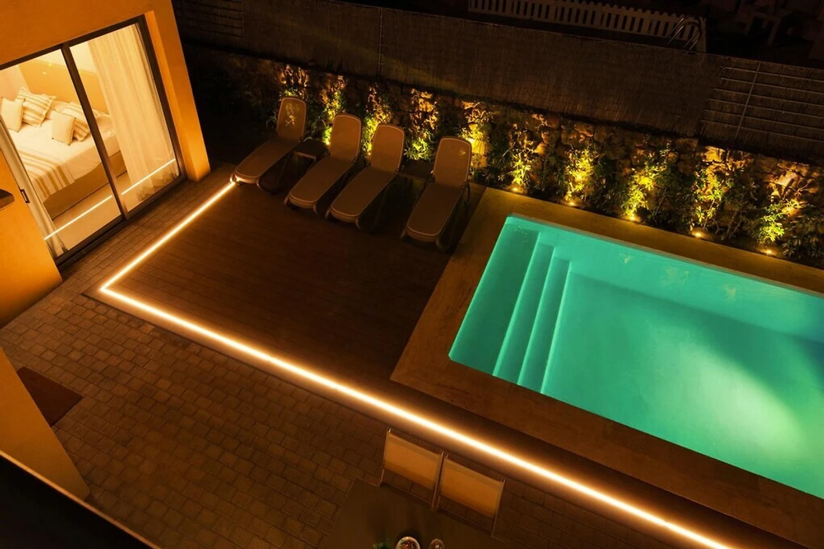 Offene Küche(Wasserkocher, Kochherd, Kaffeemaschine, Backofen, Mikrowelle, Spülmaschine, Kühl-/Gefrierkombination), Wohn/Esszimmer(TV(Satellit), DVD-Spieler), Schlafzimmer mit Badezimmer(Doppelbett, Badewanne, Toilette, Föhn), Schlafzimmer mit Badezimmer(Einzelbett, Einzelbett, Badewanne, Toilette, Bidet, Föhn), Trockner, Waschmaschine, Heizung, Klimaanlage, Terrasse(überdacht), Gartenmöbel, Parkplatz, Liegestühle, Pool(alleinige Nutzung, im Garten, beheizbar), Hochstuhl, Babybett (kostenlos)