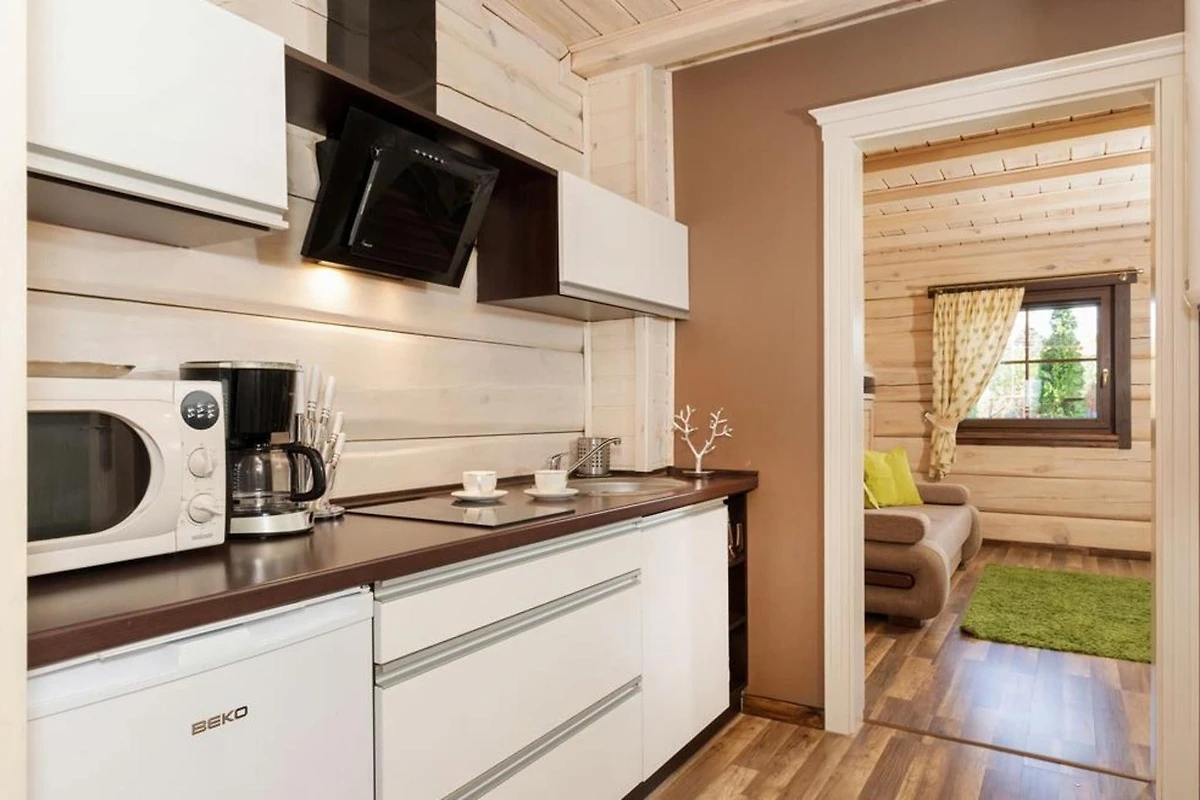 Einstöckige Reihenhäuser. Den Gästen steht ein geräumiges Wohnzimmer mit TV und einem großen Tisch zur Verfügung. An das Wohnzimmer schließt sich eine gut ausgestattete Küche an (u.a. Kaffeemaschine, Geschirrspüler, Mikrowelle). Badezimmer mit Dusche (es gibt auch eine Waschmaschine). Den Gästen stehen 2 komfortable, separate Schlafzimmer zur Verfügung. Das Haus verfügt über eine überdachte Terrasse mit Loungemöbeln und Grillmöglichkeit. Liegestühle sind vorhanden. Die Hütten verfügen über eine Heizung. WLAN ist verfügbar.