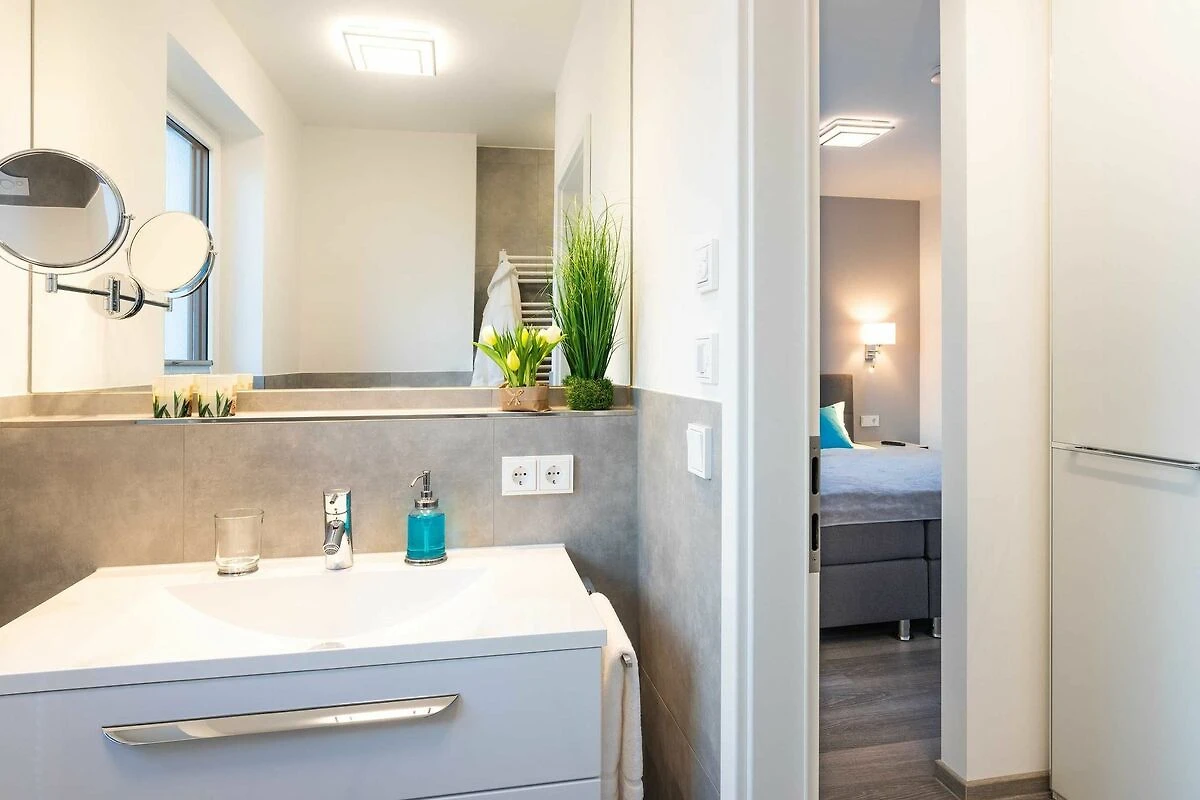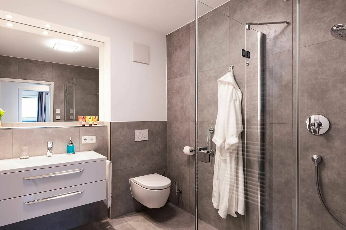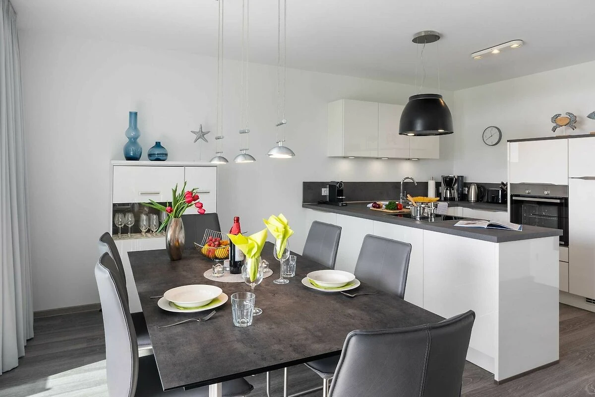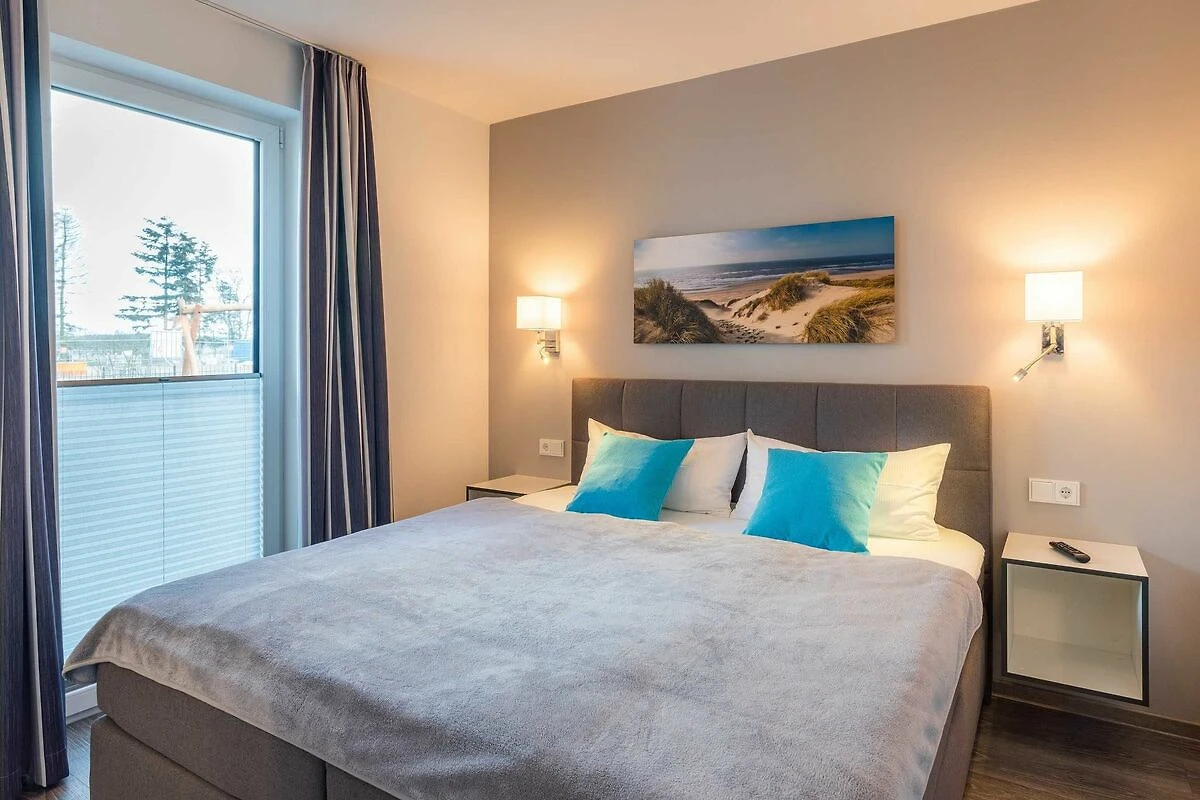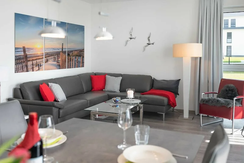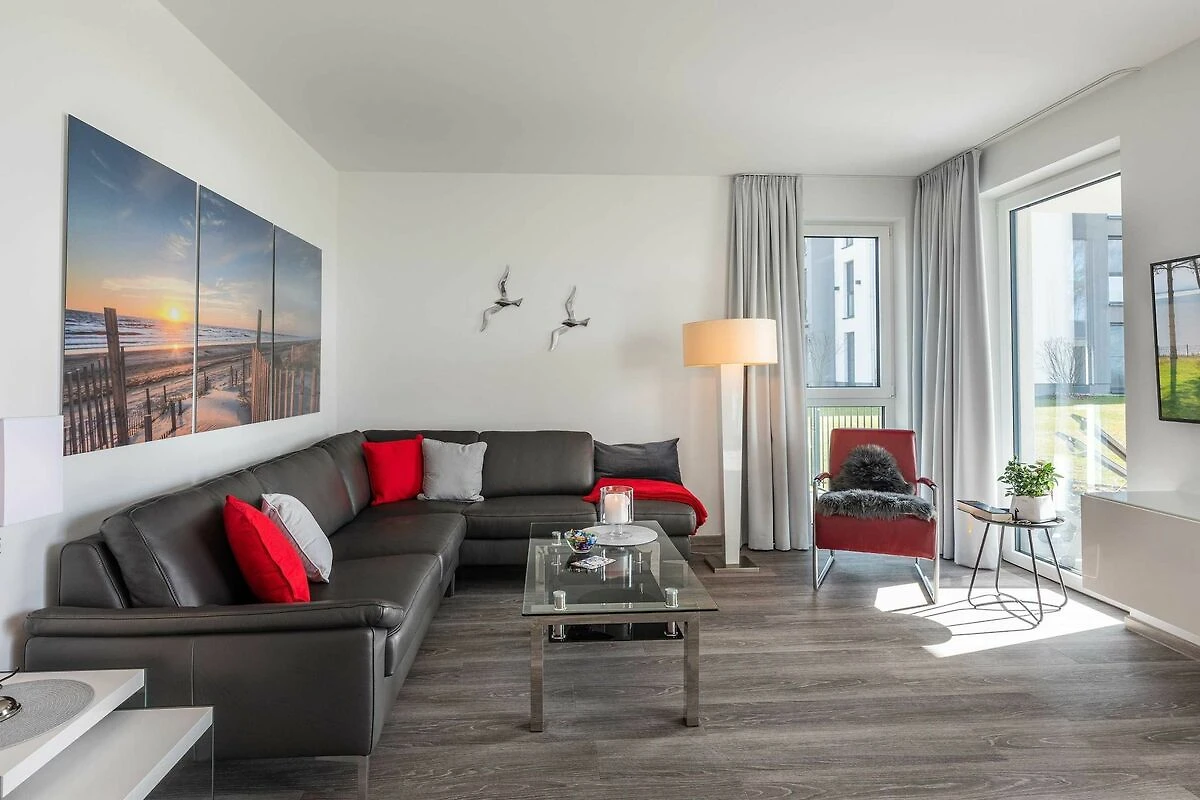 Diese luxuriöse 4-Zimmer-Wohnung im Erdgeschoss von Haus 6 mit Platz für maximal 6 Personen verfügt über eine Wohnfläche von 100 m² und hat 3 Schlafzimmer sowie 2 voll ausgestattete Duschbäder. Die grosse Sonnenterrasse mit 21 m² liegt in idealer Süd-Ausrichtung. Die Wohnung ist modern eingerichtet mit offenem Wohn-Essbereich, grossem Esstisch, Ledersofa sowie Smart-TV (inkl. Sky-Abo). Die hochwertig ausgestattete Küche, offen zum Wohnbereich, lässt keine Wünsche offen. Erholsamer Schlaf in den beiden Schlafzimmern mit Boxspringbetten und Smart-TV ist garantiert. Im dritten Schlafzimmer befindet sich ein bequemes Schlafsofa (Liegefläche: 1,60 x 2,00 m) und ein Smart-TV. Das Badezimmer en Suite ist mit einer begehbaren Dusche ausgestattet. Auf der grossen, überdachten Sonnenterrasse mit Essgruppe und jeweils zwei Relax-Sesseln, Fusshockern, Sonnenschirm und Sonnenliegen können Sie die Seele baumeln lassen.