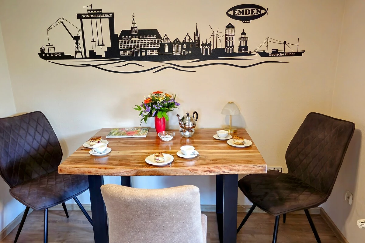 Das Ferienhaus “Wattkieker” ist ruhig gelegen in einer Tempo 30-Zone, erreichbar nur über einen Privatweg steht das Haus “Wattkieker” auf einem 1400 qm großen Grundstück. Dies lässt Kinderherzen höher schlagen. Zwei Einstellplätze für Ihr Auto sind direkt am Haus vorhanden. Eine sichtgeschützte Sonnenterrasse lädt den ganzen Tag zum Sonnenbaden ein. Das Freibad, ein Supermarkt, der Bäcker und der nächste Bus sind in 300 m bzw. in 5 Minuten zu Fuß bequem zu erreichen. Für einen ausdauernden Spaziergang ist der “Hammrich” in unmittelbarer Nähe. Für Radfahrer bietet sich die Dollart-Route an. Hier gibt es sehr gut ausgebautes Wegenetz rund um den Dollart. Natur pur gibt es im Ökowerk Emden, dass auch zu Fuss in 20 Minuten zu erreichen ist (Sehr empfehlenswert für die Kinder). Die ostfriesische Nordseeküste und ganz besonders Emden ist zu jeder Jahreszeit eine Reise wert. Ob Sie nun eines der schönen Traumschiff-Ausdockungen der Papenburger Meyer Werft besuchen, oder die zahlreichen kulturellen Angebote, ob Strand, romantische Strandspaziergänge, Radtouren durch die wunderschöne Landschaft - oder einfach nur das “Erholen” im Garten, im Winter unseren Weihnachtsmarkt, unsere “SeeHafenStadt” Emden und die Umgebung haben für jedermann etwas zu vor 1200 Jahren begann die Stadtgeschichte der Seehafenstadt Emden mit der Handelsniederlassung. Emden liegt an der Mündung der Ems, direkt gegenüber dem Dollart. Von hier aus erreicht man mit dem Schiff die Nordsee-Insel Borkum, auch Fahrten nach Helgoland und zu den anderen ostfriesischen und in die Niederlande (Delfzijl) sind möglich. Auch die wunderschöne Altstadt von Leer ist in 20 Minuten zu lädt ein mit seinem weit verzweigten Wasserwegenetz aus Kanälen und Tiefs - hier kann man per Boot fast 150 km in und um Emden zurücklegen. Eine Paddel und Pedal Station sowie ein Treetbootverleih sind bequem mit dem Fahrrad oder per Bus zu erreichen. Für Geniesser gibt es motorisierte Rundfahrten durch die Kanäle und auch eine in der Nähe liegen die Naherholungsgebiete "Uphuser Meer", "Kleines Meer" (die Hieve) und das "Große Meer" mit Möglichkeiten zum Segeln, Paddeln und Angeln. Auch sie sind bequem mit dem Fahrrad oder mit dem Auto zu Emder Stadtteil Petkum, in der Nähe der Stadtteile Borssum, Widdelswehr und Jarßum kann man mit der kleinen Emsfähre fast stündlich in den Fischerort Ditzum auf der gegenüberliegenden Seite der Ems übersetzen. Sehenswürdigkeiten gibt es in Emden für jeden Geschmack: die Emder Kunsthalle, die vom Stern-Gründer Henry Nannen gestiftet wurde