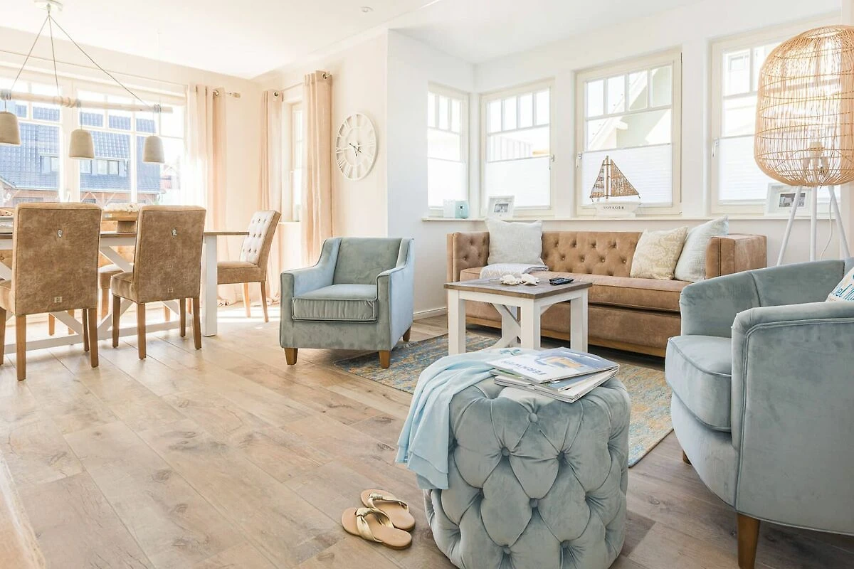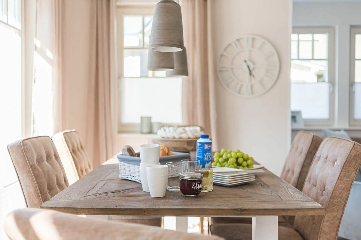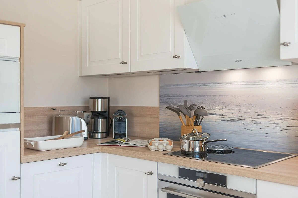 Treten Sie ein in die Doppelhaushälfte Meerzeit und lassen Sie sich von der modernen und hellen Einrichtung verzaubern. Die offene Gestaltung des Wohnraums mit Küche, Essbereich und Sofaecke lädt zum Entspannen und gemeinsamen Beisammensein ein. An kalten Tagen sorgt der Kaminofen für wohlige Wärme, während Sie an lauen Sommerabenden auf der Westterrasse die Abendsonne geniessen können.