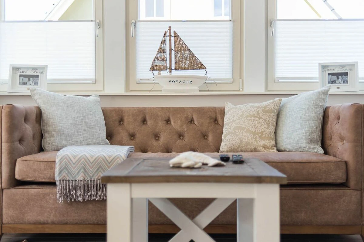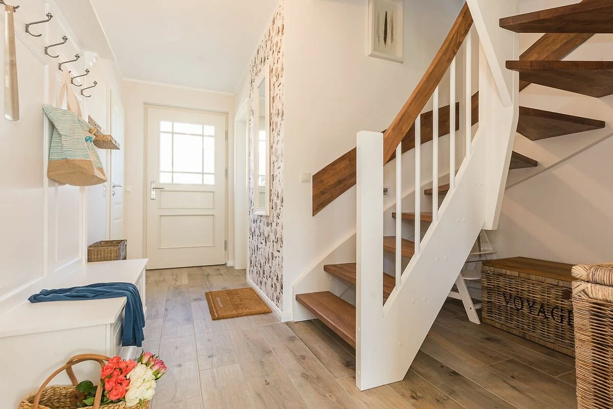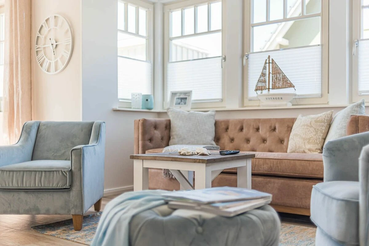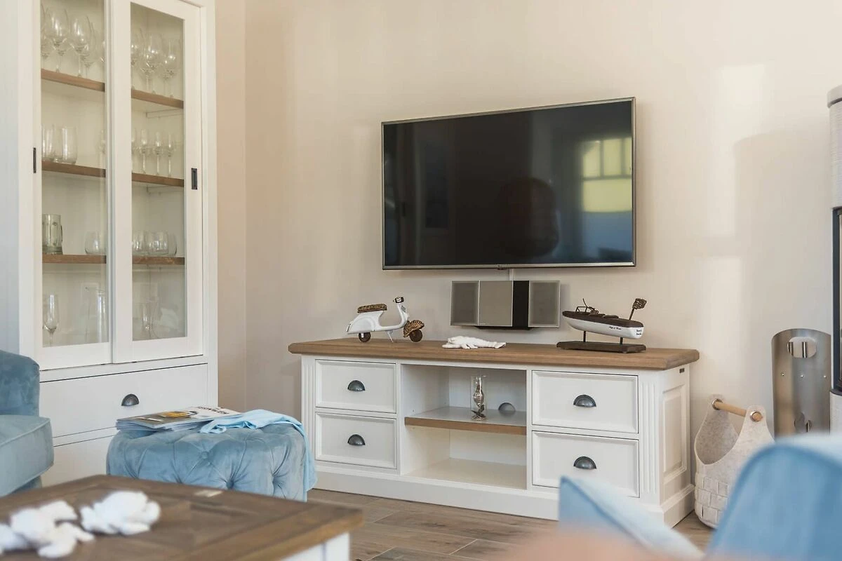 Treten Sie ein in die Doppelhaushälfte Meerzeit und lassen Sie sich von der modernen und hellen Einrichtung verzaubern. Die offene Gestaltung des Wohnraums mit Küche, Essbereich und Sofaecke lädt zum Entspannen und gemeinsamen Beisammensein ein. An kalten Tagen sorgt der Kaminofen für wohlige Wärme, während Sie an lauen Sommerabenden auf der Westterrasse die Abendsonne geniessen können.