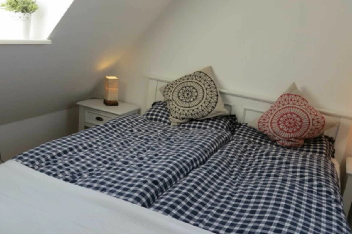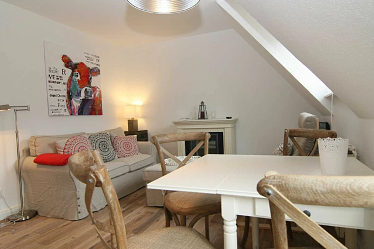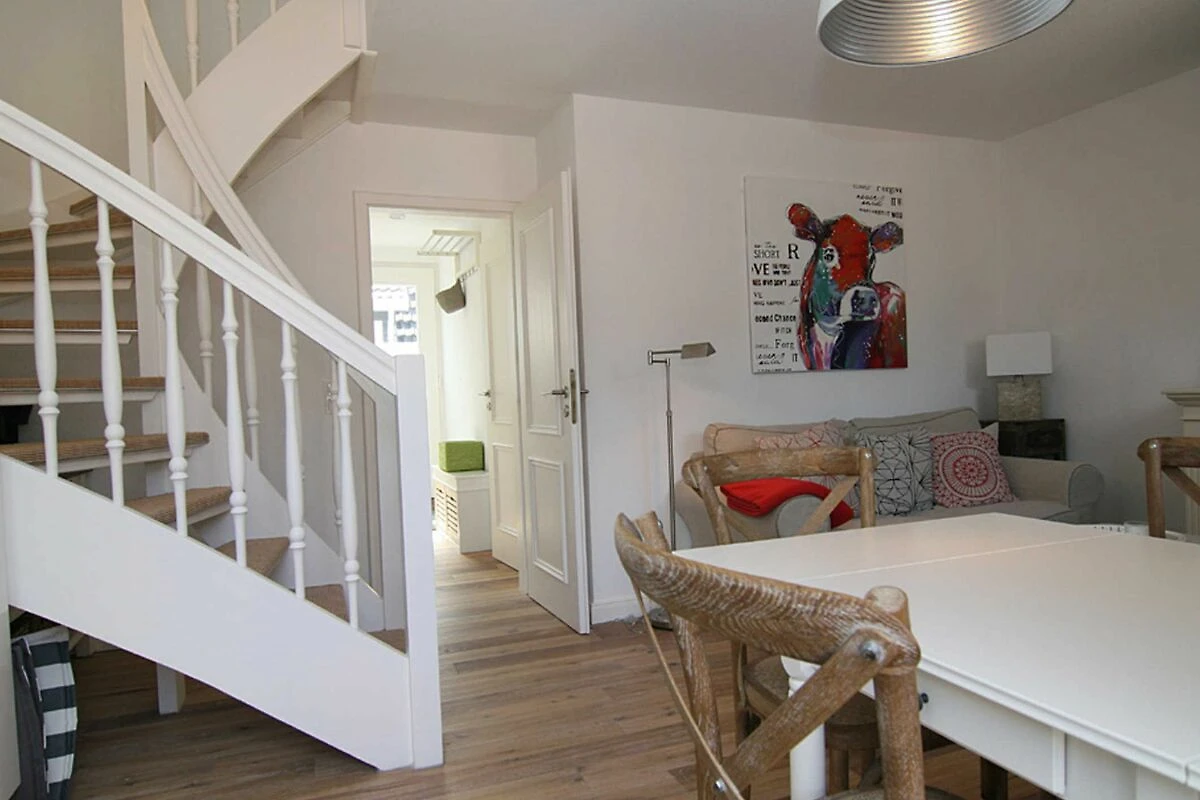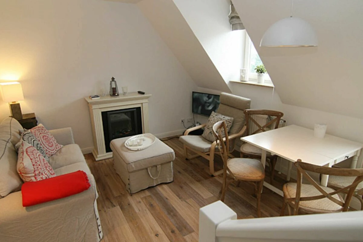 Für eine Familie mit 4 Personen oder auch für zwei Paare werden sich hier im Urlaub rundum erholen. Vom Flurbereich gelangen Sie in ein Schlafzimmer mit Doppelbett, ein Duschbad und in den komfortablen Wohnraum mit Esstisch und eine komplett eingerichtete Küchenzeile. Der elektrische Kamin vermittelt auch in den Wintermonaten eine wohlige Wärme. Vom Wohnraum aus gelangen Sie über eine Treppe in den oberen Schlafbereich. Eine kleine gemütliche Dachterrasse mit Möblierung, die vom Nachbarn durch Pflanzen abgetrennt ist, gehört zur Ausstattung dazu.