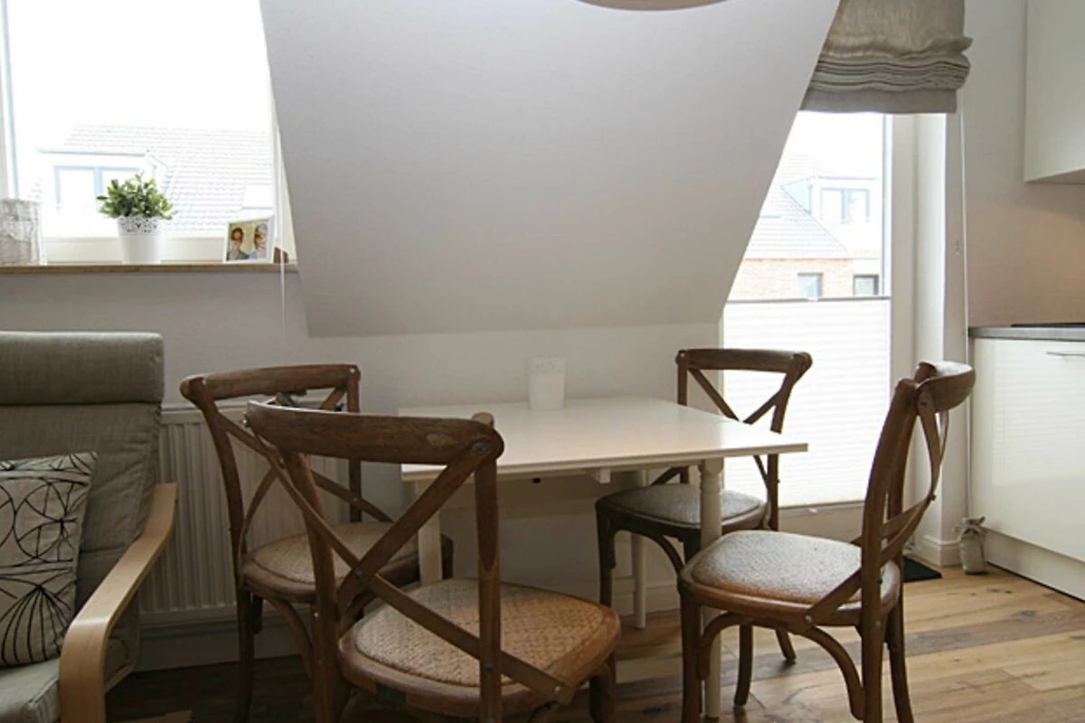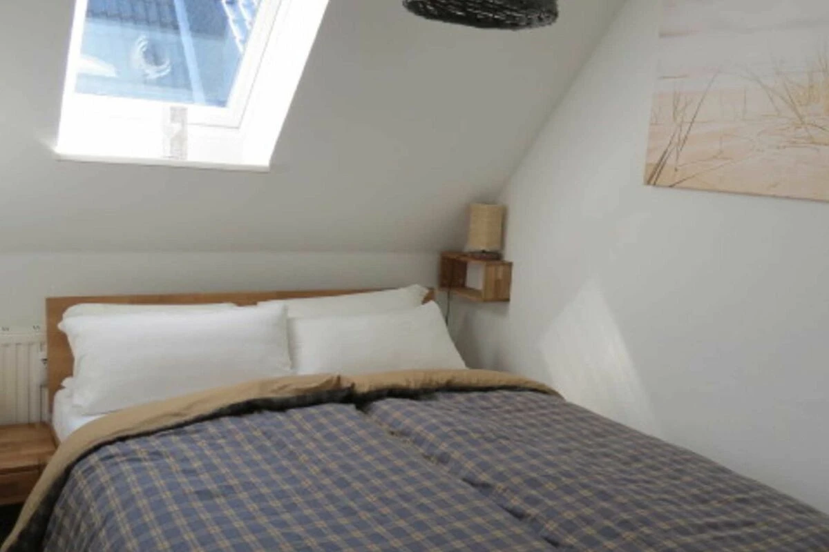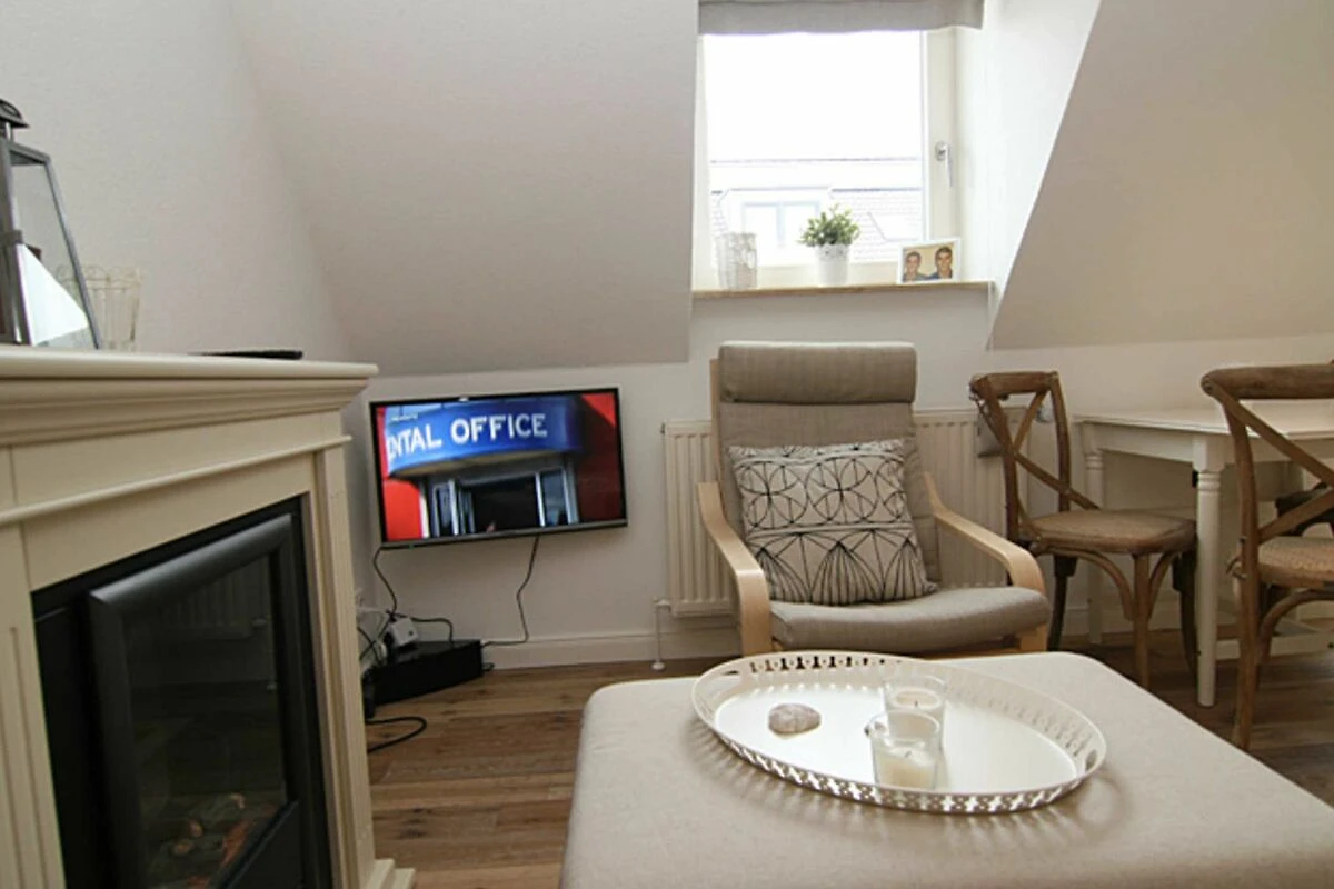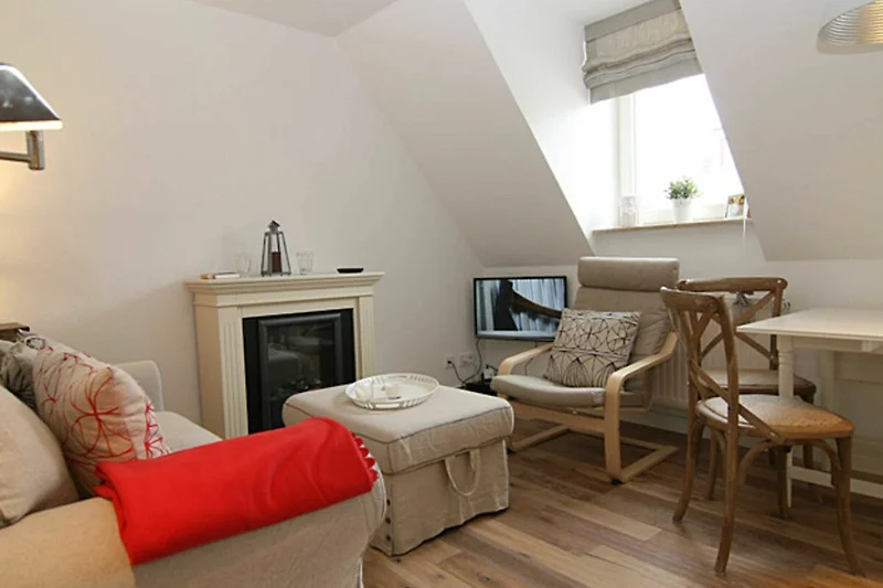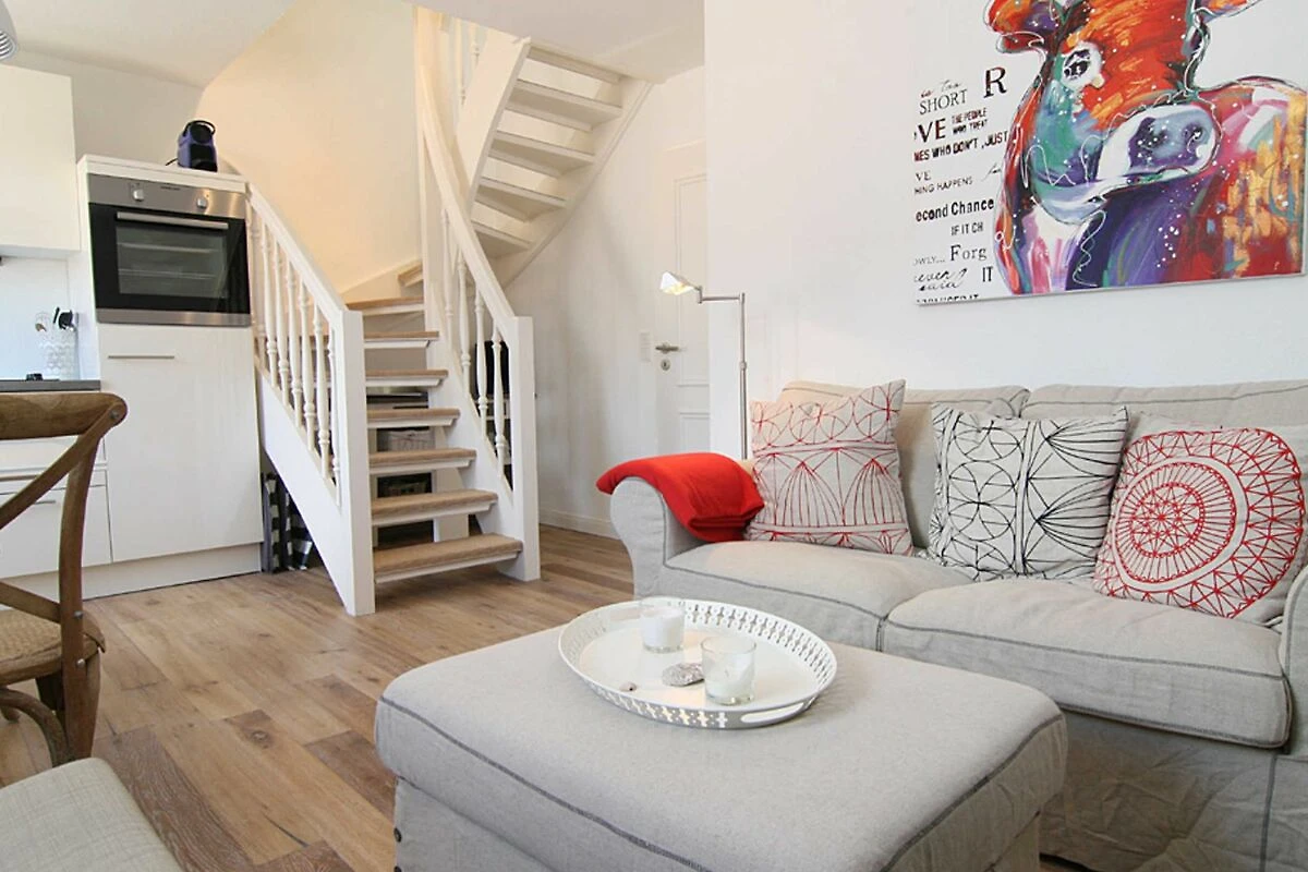 Für eine Familie mit 4 Personen oder auch für zwei Paare werden sich hier im Urlaub rundum erholen. Vom Flurbereich gelangen Sie in ein Schlafzimmer mit Doppelbett, ein Duschbad und in den komfortablen Wohnraum mit Esstisch und eine komplett eingerichtete Küchenzeile. Der elektrische Kamin vermittelt auch in den Wintermonaten eine wohlige Wärme. Vom Wohnraum aus gelangen Sie über eine Treppe in den oberen Schlafbereich. Eine kleine gemütliche Dachterrasse mit Möblierung, die vom Nachbarn durch Pflanzen abgetrennt ist, gehört zur Ausstattung dazu.