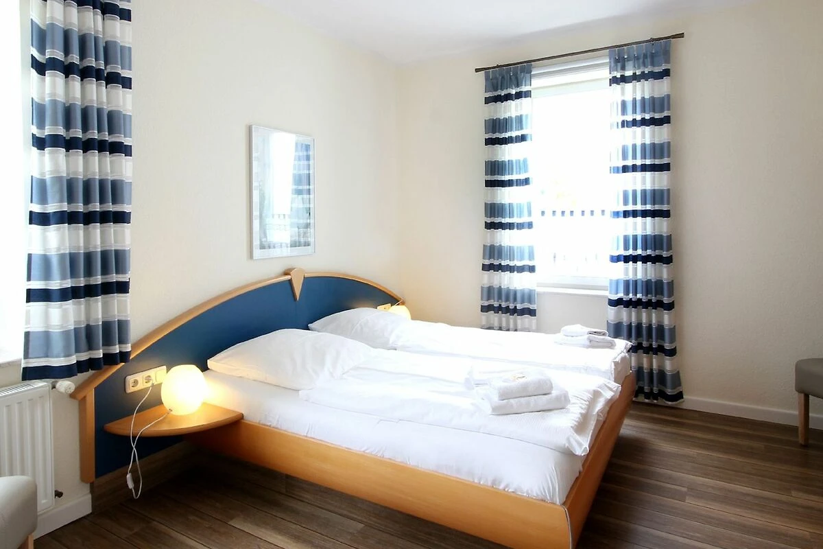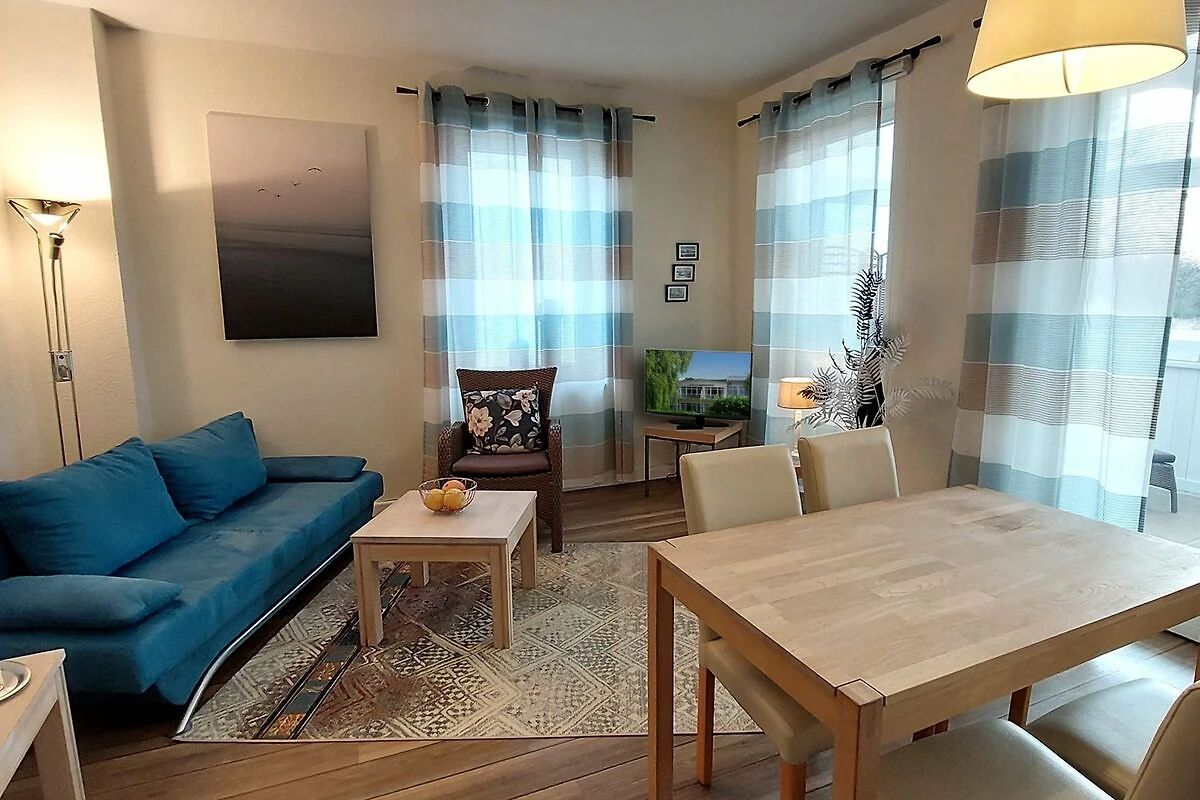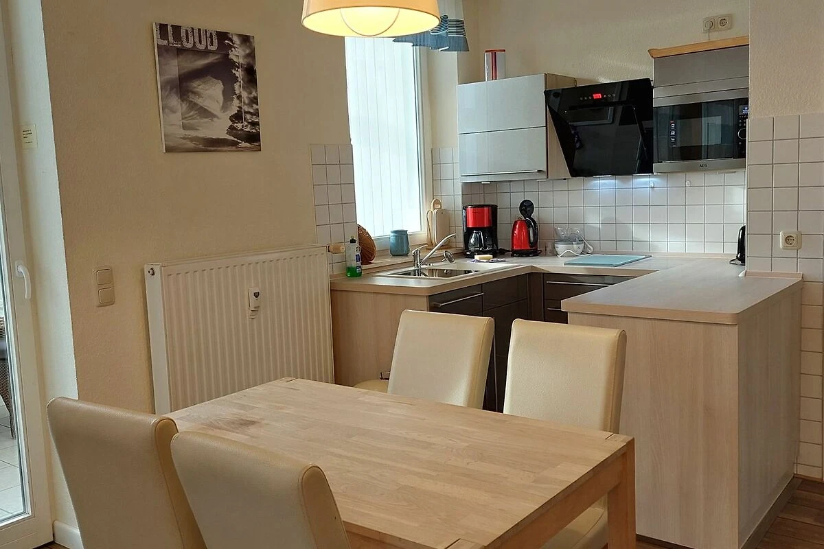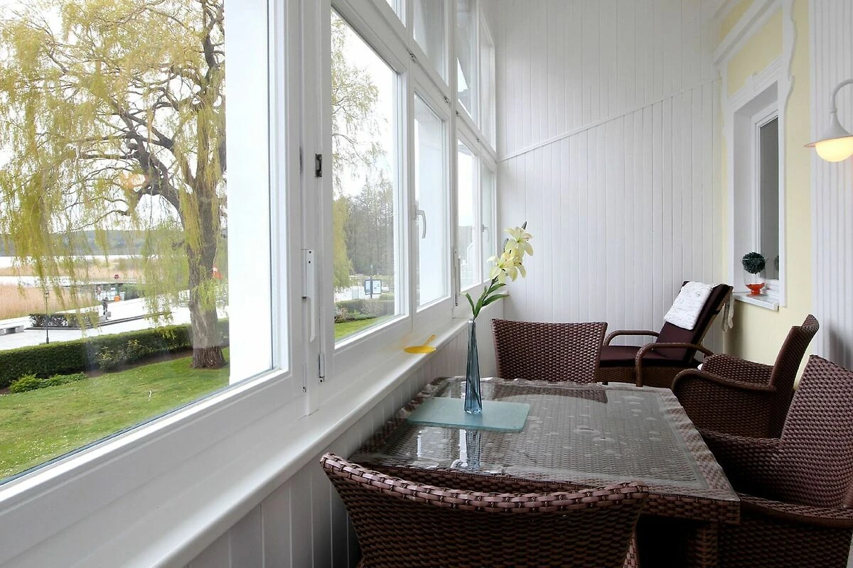 Ihre 2-Raum Nichtraucher - Ferienwohnung 37RB9 hat eine Grösse von ca. 64 qm und ist für max. 3 Personen eingerichtet. Sie befindet sich im 1. Obergeschoss der Villa. Der dazugehörige Wintergarten mit einen wunderschönen Blick über den Schmachter See ist zu jeder Jahreszeit ein Traum. Ihre Wohnung bietet zu allen Jahreszeiten auch bei Regenwetter einen Logenplatz mit einer bezaubernden Aussicht über die vielfältige Landschaft. Die Ferienwohnung bietet einen kombinierten Wohnraum mit einem Essplatz und einer Sitzgruppe, die auch eine Schlafgelegenheit für 1 Kind bietet. Ausserdem sind eine offene moderne Küche, ein Schlafzimmer, ein Tageslicht-Duschbad mit Waschtisch und WC vorhanden. Alle Räume sind mit einem robusten Holzfussboden ausgestattet. Die technische Ausstattung beinhaltet ein Flachbild-TV, kostenfreien WLAN-Zugang und eine Hifi-Anlage. Die Küche ist mit Kühlschrank mit Gefrierfach, Mikrowelle, Geschirrspüler, Cerankochfeld, Kaffeemaschine, Wasserkocher und anderen „Küchenhelfern“ komplett ausgestattet. Das grosse Schlafzimmer bietet genügend Platz für ein Doppelbett und einen Kleiderschrank.
