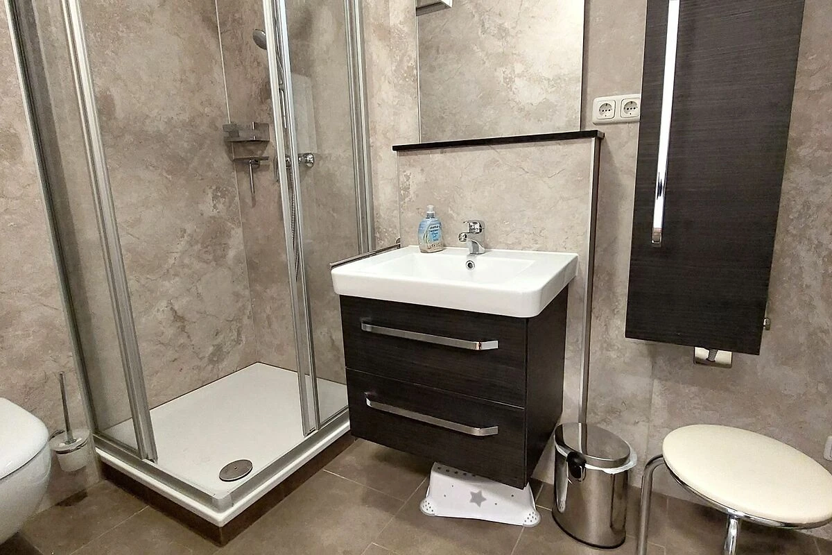 Die beiden Schlafräume sind jeweils mit einem Doppelbett und Kleiderschrank ausgestattet. Im Hauptschlafzimmer finden Sie einen zusätzlichem TV. Das kleinere Schlafzimmer verfügt über einen Schreibtisch und ein fusshohes grosses Fenster (franz. Balkon). Beide Schlafzimmer sind durch die elektrischen Aussenjalousien verdunkelbar. Die Badezimmer verfügen jeweils über Waschtisch, Dusche und WC. Die Küchenzeile beinhaltet u.a. einen Geschirrspüler, Kochfeld, Kaffeemaschine, Wasserkocher und Toaster.