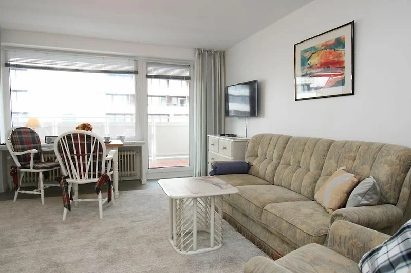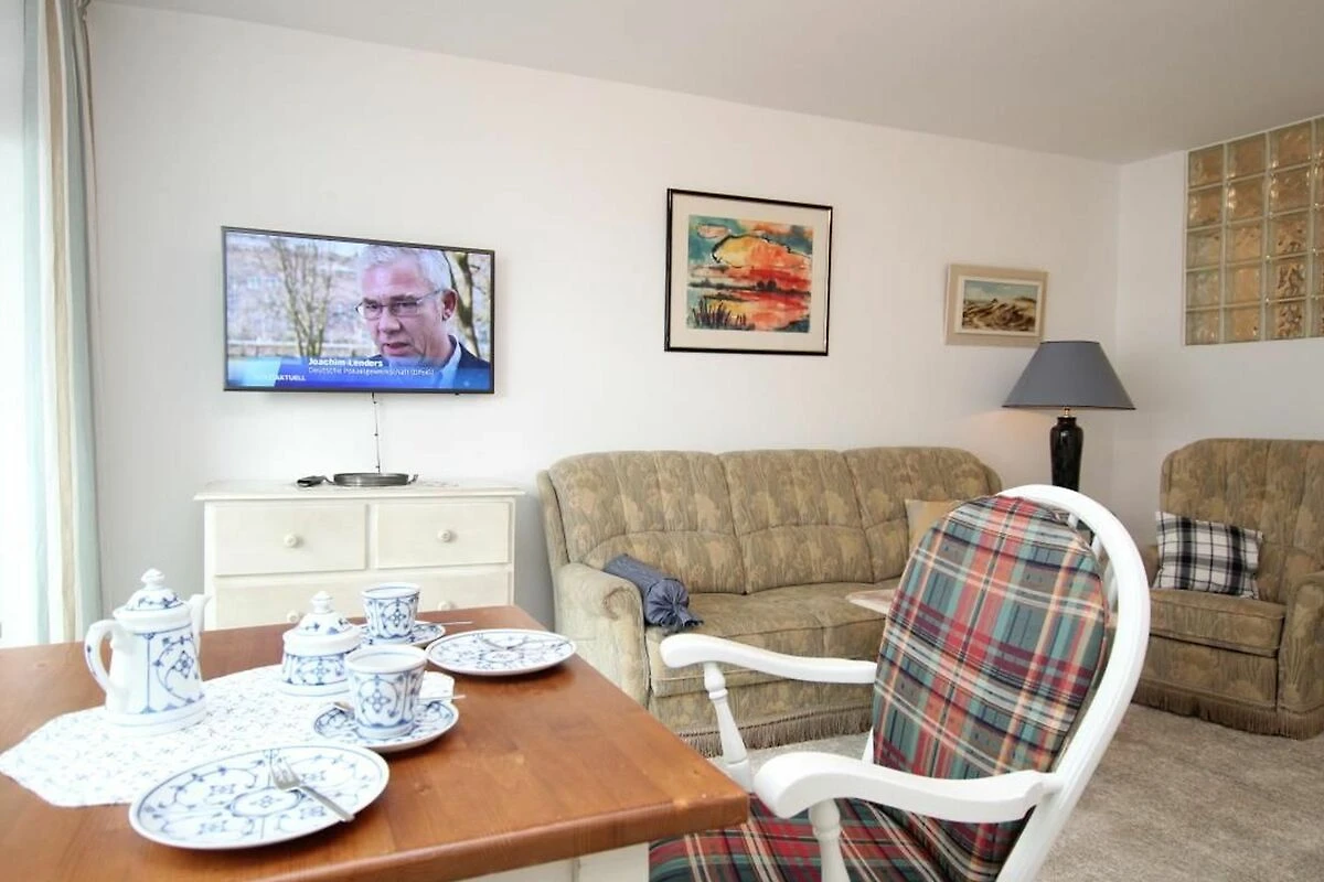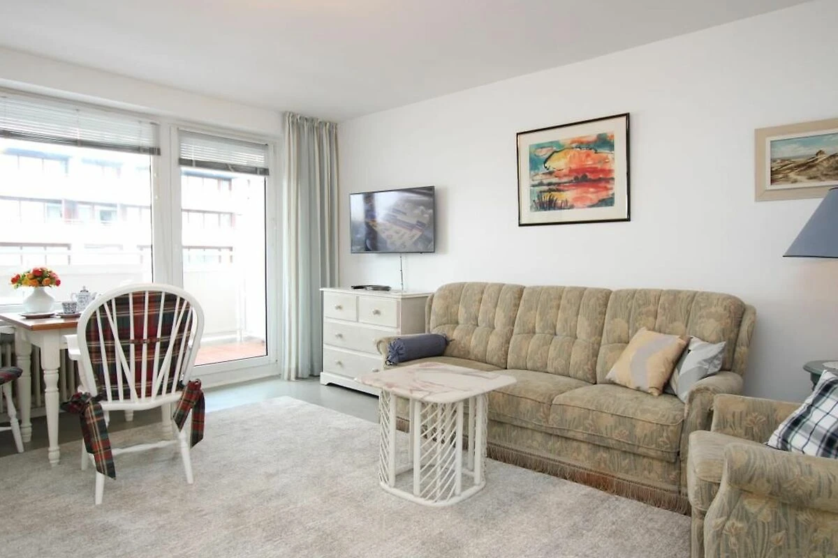 Im Wohnzimmer stehen eine Couchgarnitur und vor dem Fenster der Essplatz. In einer weissen Schrankwand sind zwei nebeneinander stehende einzeln aufklappbare Schrankbetten untergebracht. Die kleine Küche ist vom Wohnzimmer getrennt. Vom Balkon kann man seitlich das Meer hinter der Sylter Welle sehen. Das Bad hat eine Dusche. Das Appartement ist mit WLan und Telefon (ins deutsche Festnetz) ausgestattet.