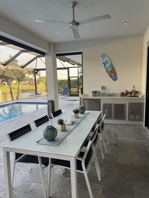 Das Haus ist wunderschön gestaltet, man merkt die Liebe zum Detail in allen Räumen. Allein schon die Begrüßung, mit Musik und gedecktem Tisch war das 1.Highlight. Das Haus ist sehr gepflegt und sauber und die Betten ein Traum zum schlafen.Die Lage am Kanal top und die Gegend rundherum ruhig , aber trotzdem sind Publix, Target usw für den Einkauf schnell erreicht, ebenso wie Pine Island ( toller Sonnenuntergang) oder die Strände von Sanibel/Captiva oder Lovers Key.