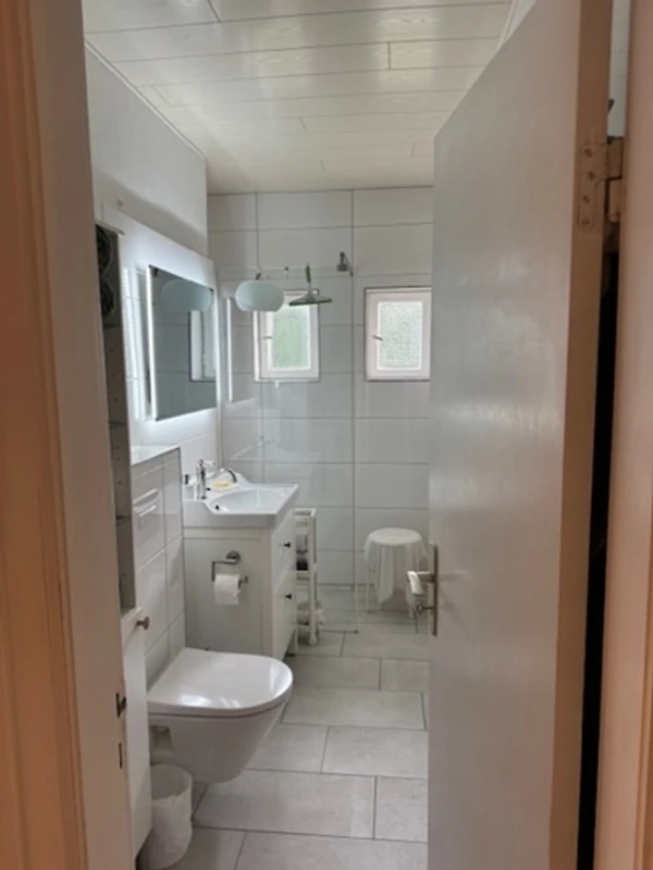 Teppiche im Haus. Im Wohn-und Schlafbereich sind geölte, bzw. versiegelte Parkettböden in den anderen Bereichen Fliesen. Das Bad ist mit Dusche, Waschbecken