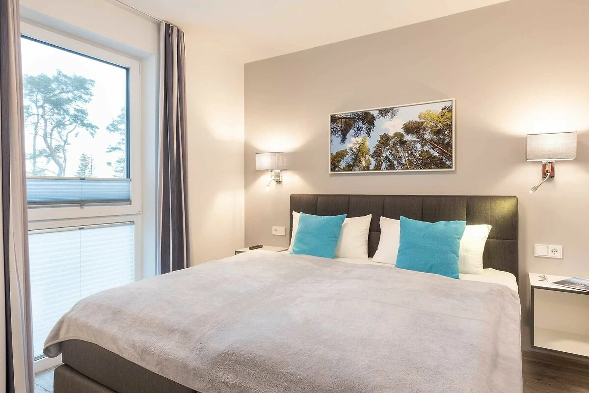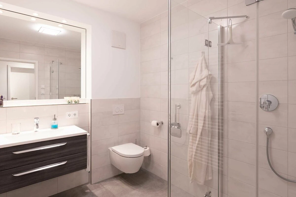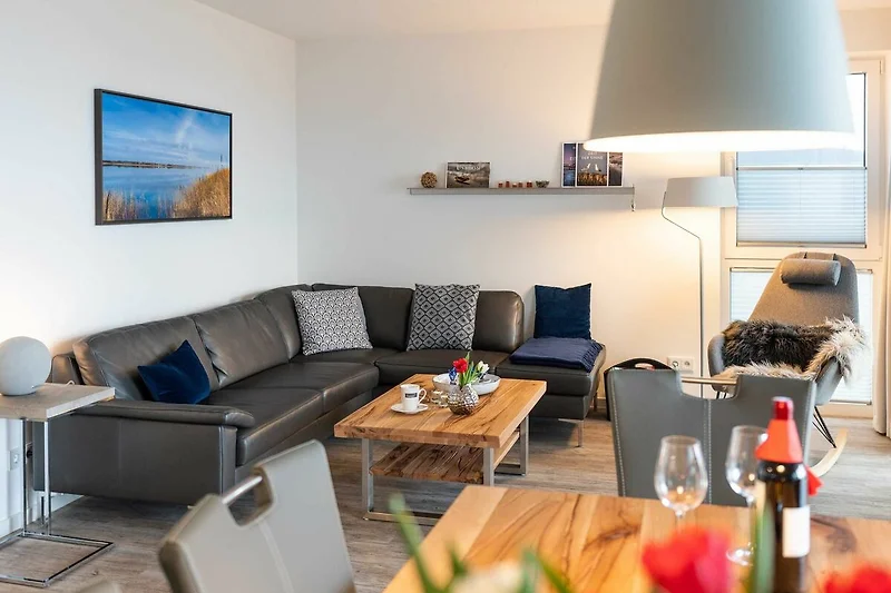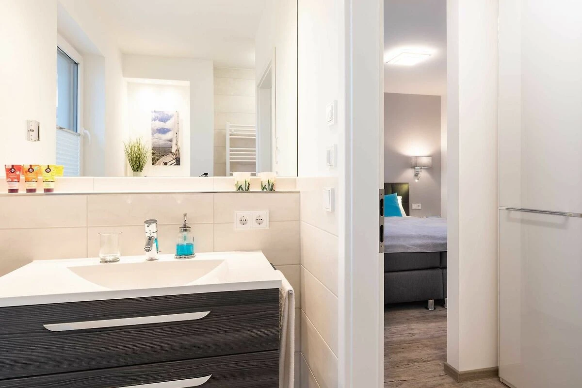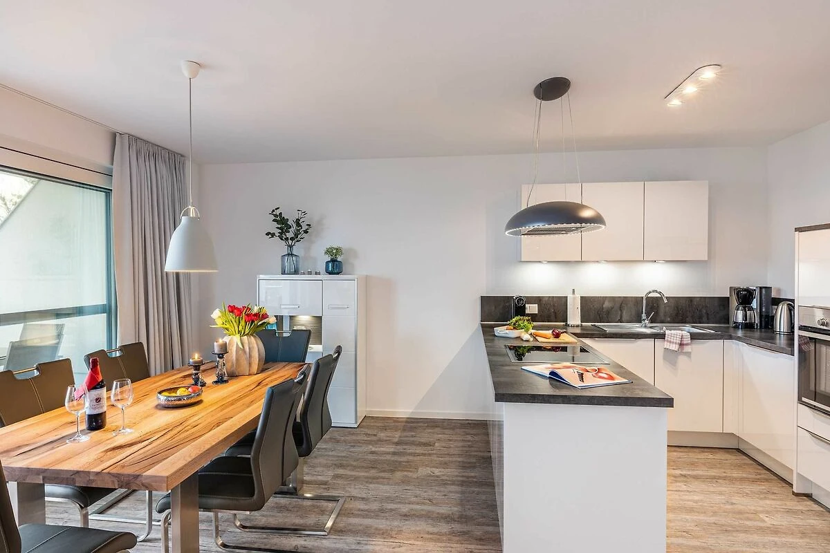 Diese lichtdurchflutete, helle 4-Zimmer-Wohnung im obersten Geschoss von Haus 7 (Aufzug vorhanden) mit Platz für maximal 6 Personen verfügt über eine Wohnfläche von 100 m² und hat 3 Schlafzimmer sowie 2 voll ausgestattete Duschbäder. Die grosse Sonnenterrasse mit 17 m² liegt in idealer Süd-Ausrichtung. Die Wohnung ist modern eingerichtet mit offenem Wohn-Essbereich, grossem Esstisch, Ledersofa sowie Smart-TV (inkl. Sky-Abo). Die hochwertig ausgestattete Küche, offen zum Wohnbereich, lässt keine Wünsche offen. Erholsamer Schlaf in den beiden Schlafzimmern mit Boxspringbetten und Smart-TV ist garantiert. Im dritten Schlafzimmer befindet sich ein bequemes Schlafsofa (Liegefläche: 1,60 x 2,00 m) und ein Smart-TV. Das Badezimmer en Suite ist mit einer begehbaren Dusche ausgestattet. Auf der grossen, überdachten Sonnenterrasse mit Essgruppe und jeweils zwei Relax-Sesseln, Fusshockern sowie einem Sonnenschirm können Sie die Seele baumeln lassen.