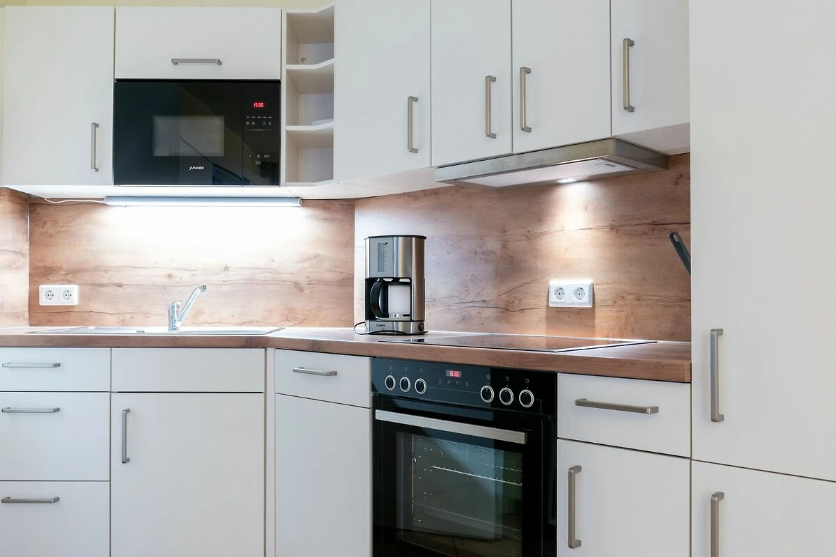 Die Ausstattung der Wohnung umfasst unter anderem einen Flachbildfernseher, eine Kaffeemaschine (Filter), eine Mikrowelle und einen Geschirrspüler. Die Bettwäsche ist bereits im Preis inklusive. Ein grosser Pluspunkt ist der Balkon, auf dem man gemütlich die frische Luft geniessen kann. Die offene Wohnküche bietet ausreichend Platz zum Kochen und Essen.