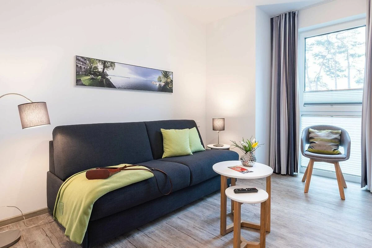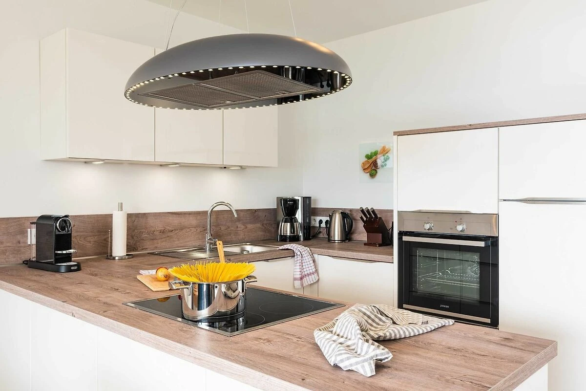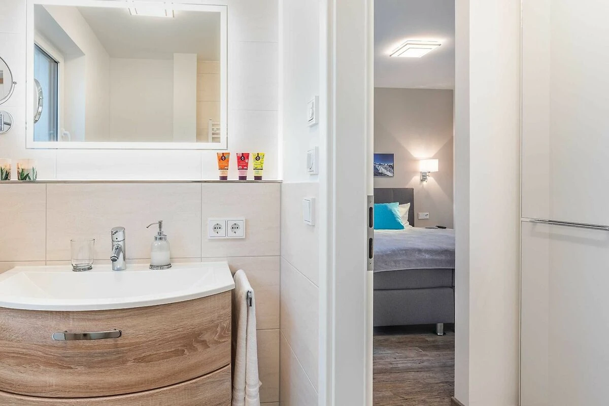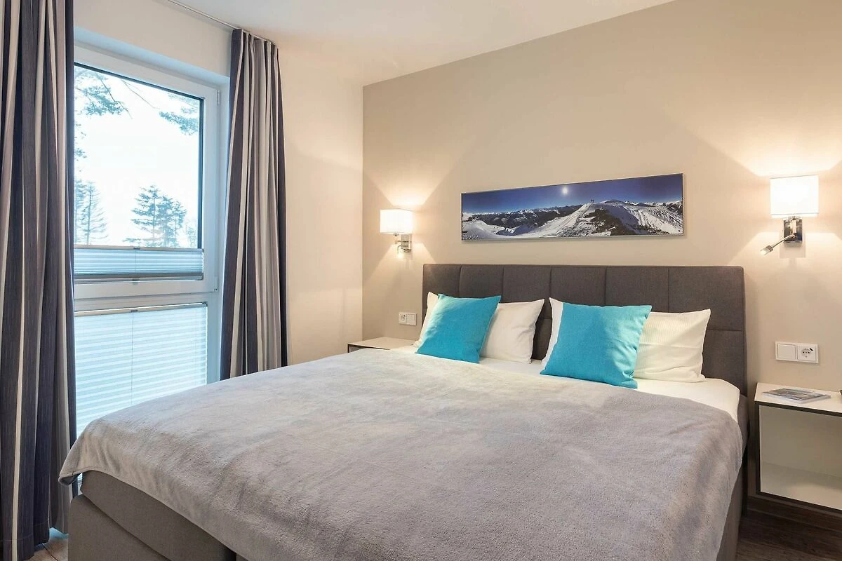 Diese luxuriöse 4-Zimmer-Wohnung im ersten Obergeschoss von Haus 6 (Aufzug vorhanden) mit Platz für maximal 6 Personen verfügt über eine Wohnfläche von 100 m² und hat 3 Schlafzimmer sowie 2 voll ausgestattete Duschbäder. Die grosse Sonnenterrasse mit 17 m² liegt in idealer Süd-Ausrichtung. Die Wohnung ist modern eingerichtet mit offenem Wohn-Essbereich, grossem Esstisch, Ledersofa sowie Smart-TV (inkl. Sky-Abo). Die hochwertig ausgestattete Küche, offen zum Wohnbereich, lässt keine Wünsche offen. Erholsamer Schlaf in den beiden Schlafzimmern mit Boxspringbetten und Smart-TV ist garantiert. Im dritten Schlafzimmer befindet sich ein bequemes Schlafsofa (Liegefläche: 1,60 x 2,00 m) und ein Smart-TV. Das Badezimmer en Suite ist mit einer begehbaren Dusche ausgestattet. Auf dem grossen, überdachten Sonnenbalkon mit Essgruppe und zwei Relax-Sesseln, Fusshockern sowie einem Sonnenschirm können Sie die Seele baumeln lassen.