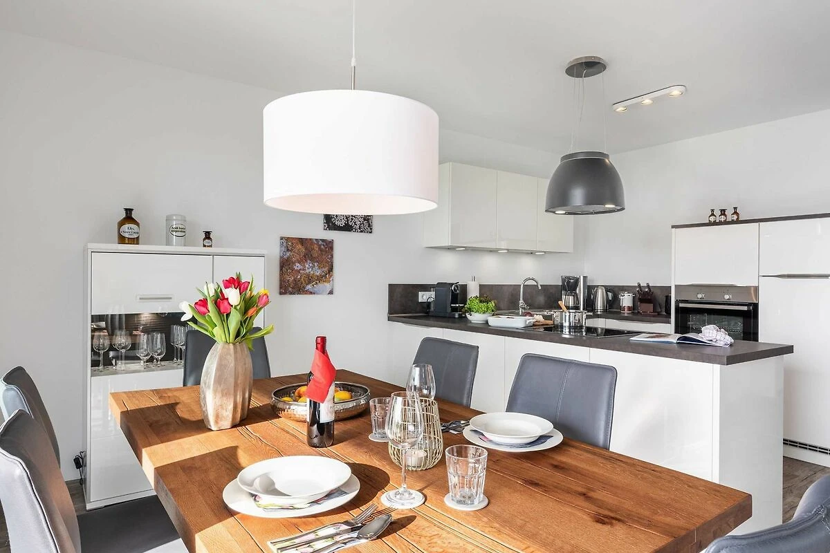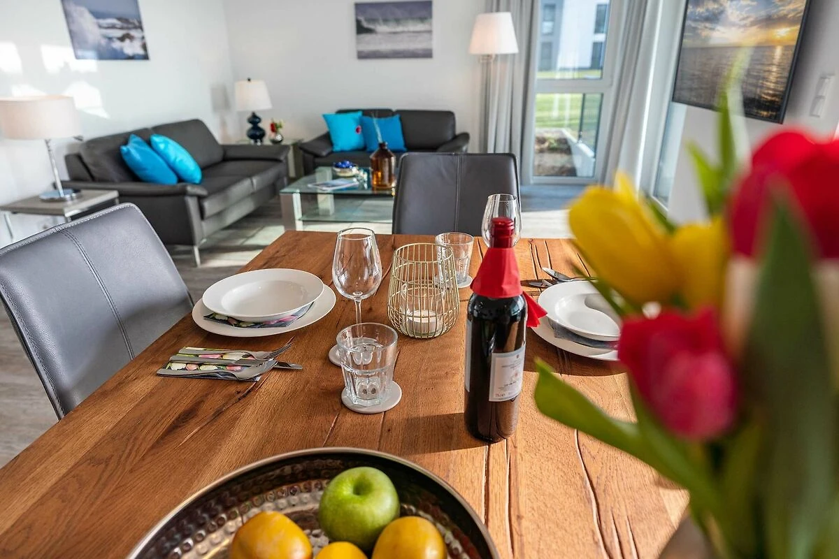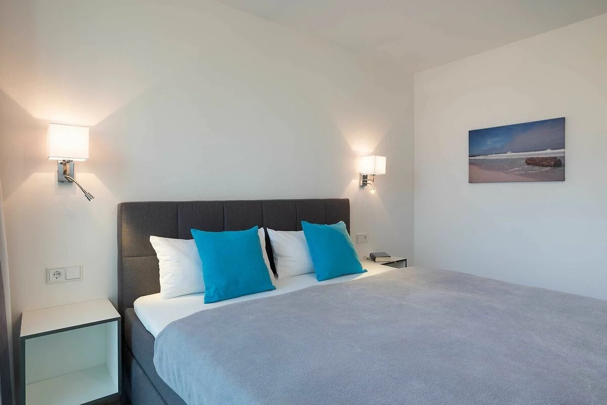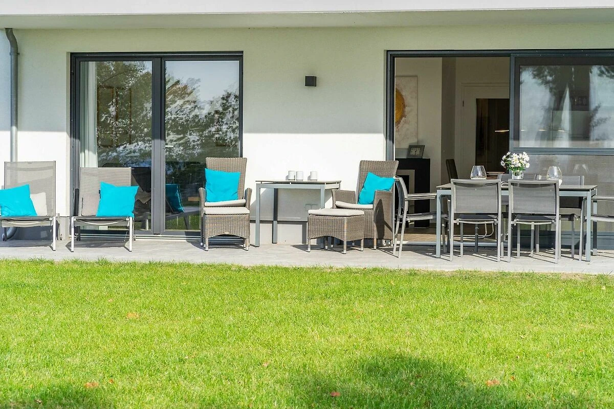 Diese luxuriöse 4-Zimmer-Wohnung im Erdgeschoss von Haus 7 mit Platz für maximal 6 Personen verfügt über eine Wohnfläche von 100 m² und hat 3 Schlafzimmer sowie 2 voll ausgestattete Duschbäder. Die grosse Sonnenterrasse mit 21 m² liegt in idealer Süd-Ausrichtung. Die Wohnung ist modern eingerichtet mit offenem Wohn-Essbereich, grossem Esstisch, Ledersofa sowie Smart-TV (inkl. Sky-Abo). Die hochwertig ausgestattete Küche, offen zum Wohnbereich, lässt keine Wünsche offen. Erholsamer Schlaf in den beiden Schlafzimmern mit Boxspringbetten und Smart-TV ist garantiert. Im dritten Schlafzimmer befindet sich ein bequemes Schlafsofa (Liegefläche: 1,60 x 2,00 m) und ein Smart-TV. Das Badezimmer en Suite ist mit einer begehbaren Dusche ausgestattet. Auf der grossen, überdachten Sonnenterrasse mit Essgruppe und jeweils zwei Relax-Sesseln samt Fusshockern, Sonnenschirm und Sonnenliegen können Sie die Seele baumeln lassen.