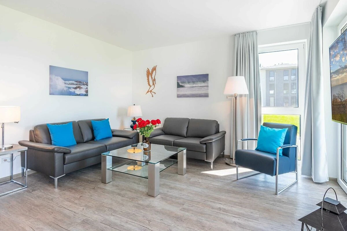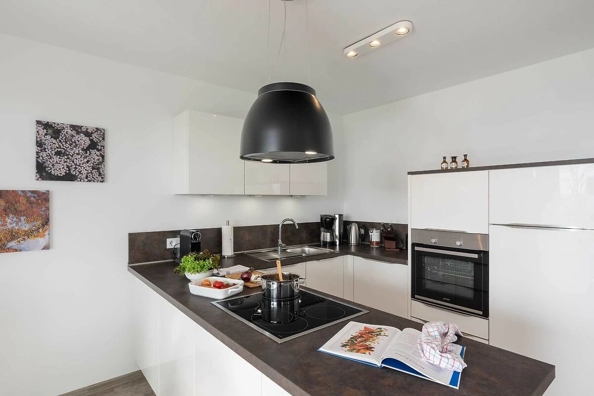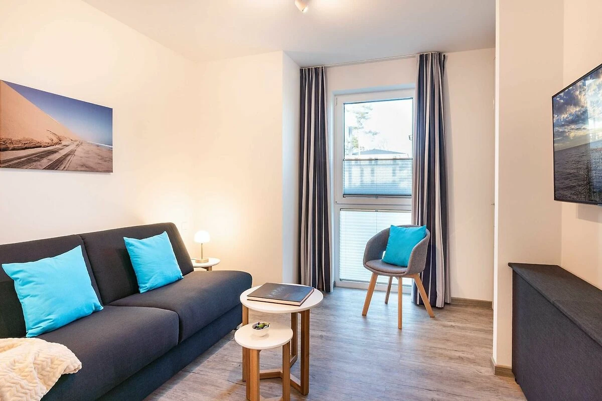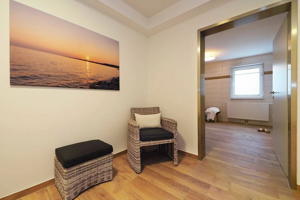 Diese luxuriöse 4-Zimmer-Wohnung im Erdgeschoss von Haus 7 mit Platz für maximal 6 Personen verfügt über eine Wohnfläche von 100 m² und hat 3 Schlafzimmer sowie 2 voll ausgestattete Duschbäder. Die grosse Sonnenterrasse mit 21 m² liegt in idealer Süd-Ausrichtung. Die Wohnung ist modern eingerichtet mit offenem Wohn-Essbereich, grossem Esstisch, Ledersofa sowie Smart-TV (inkl. Sky-Abo). Die hochwertig ausgestattete Küche, offen zum Wohnbereich, lässt keine Wünsche offen. Erholsamer Schlaf in den beiden Schlafzimmern mit Boxspringbetten und Smart-TV ist garantiert. Im dritten Schlafzimmer befindet sich ein bequemes Schlafsofa (Liegefläche: 1,60 x 2,00 m) und ein Smart-TV. Das Badezimmer en Suite ist mit einer begehbaren Dusche ausgestattet. Auf der grossen, überdachten Sonnenterrasse mit Essgruppe und jeweils zwei Relax-Sesseln samt Fusshockern, Sonnenschirm und Sonnenliegen können Sie die Seele baumeln lassen.