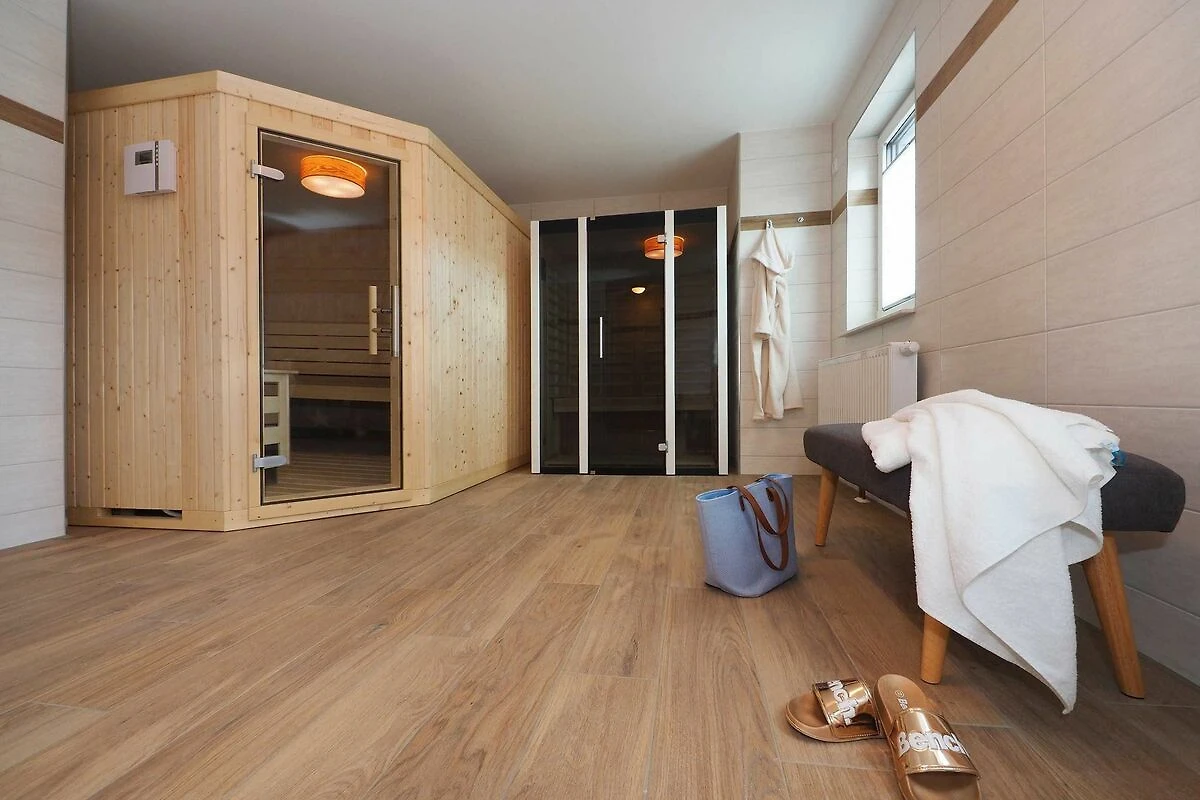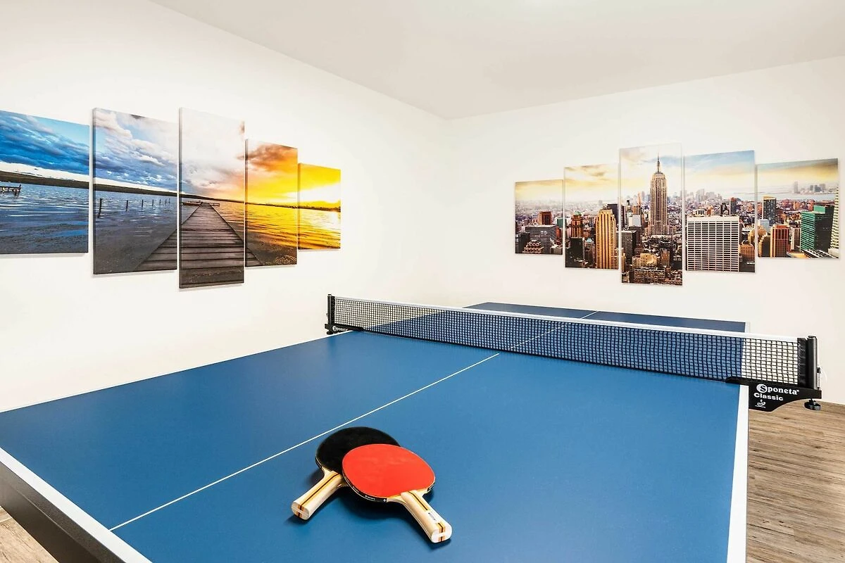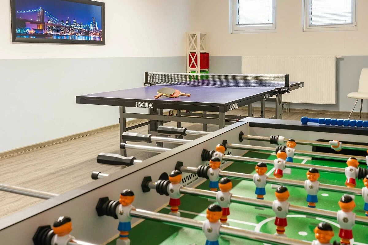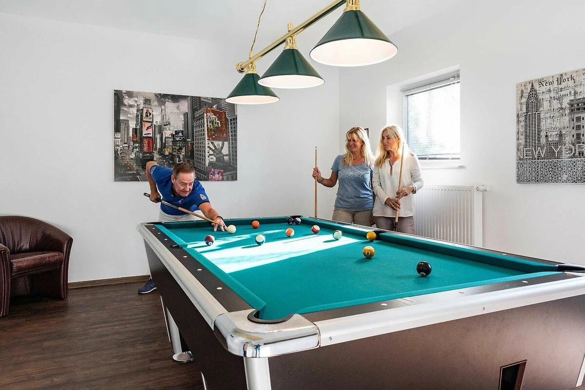 Im Basement der Häuser 1 und 2 befindet sich auf 365 m² ein weiterer Freizeit-, Fitness- und Wellnessbereich mit mehreren Saunen, Fitness-, Massage- und Aufenthaltsraum, Spielzimmer für Kleinkinder, Billard und Kicker, der Ihnen kostenlos zur Verfügung steht und die Interessen jeden Alters berücksichtigt.