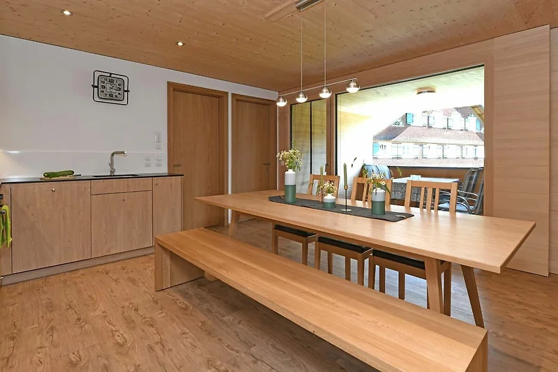 Unser Haus befindet sich mitten im Zentrum von Schoppernau. 1 Minuten Gehzeit zur Bushaltestelle. Unmittelbar in der Nähe von unserer Ferienwohnung befindet sich Sennerei, Lebensmittelgeschäft, Tourismusbüro, Vinothek, Bergbahnen Diedamskopf, Gasthäuser und Arzt.