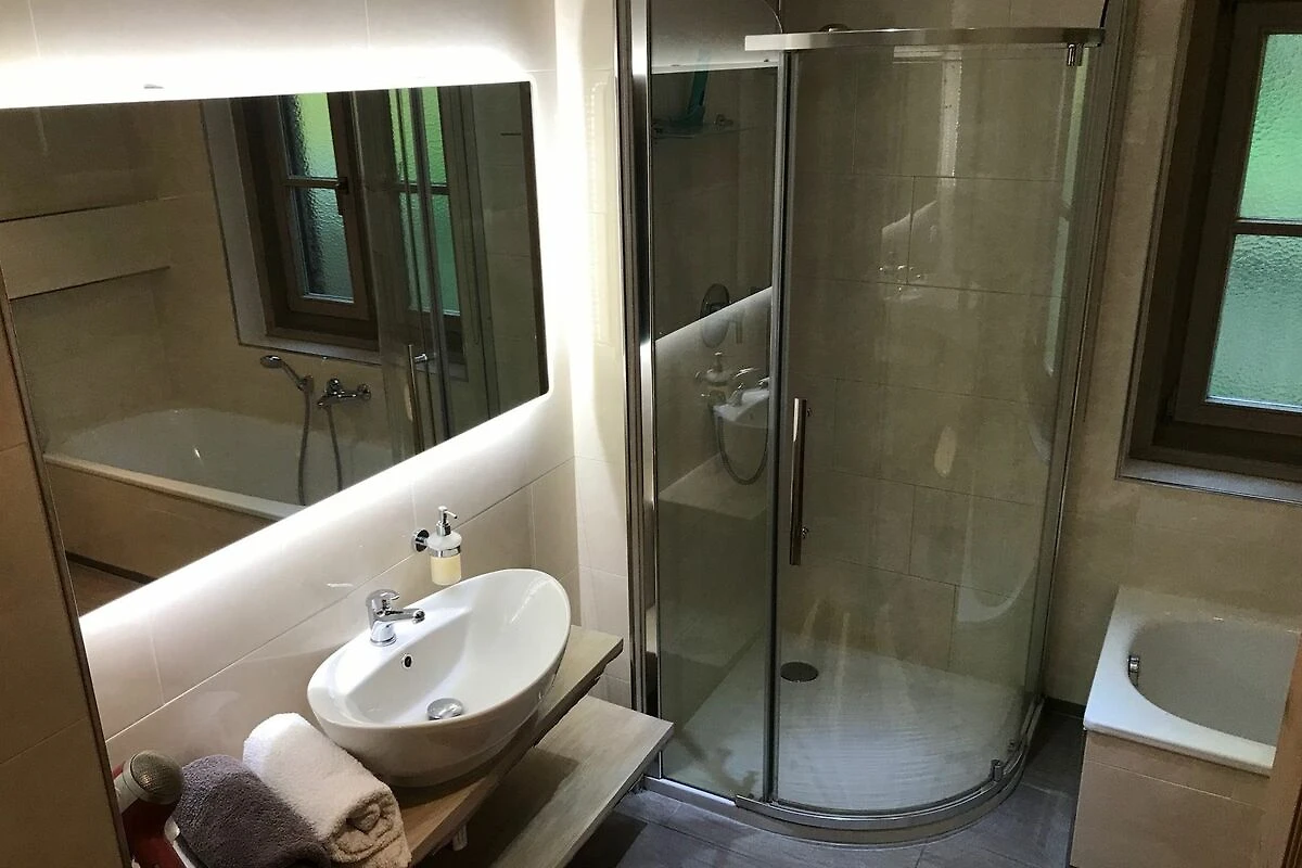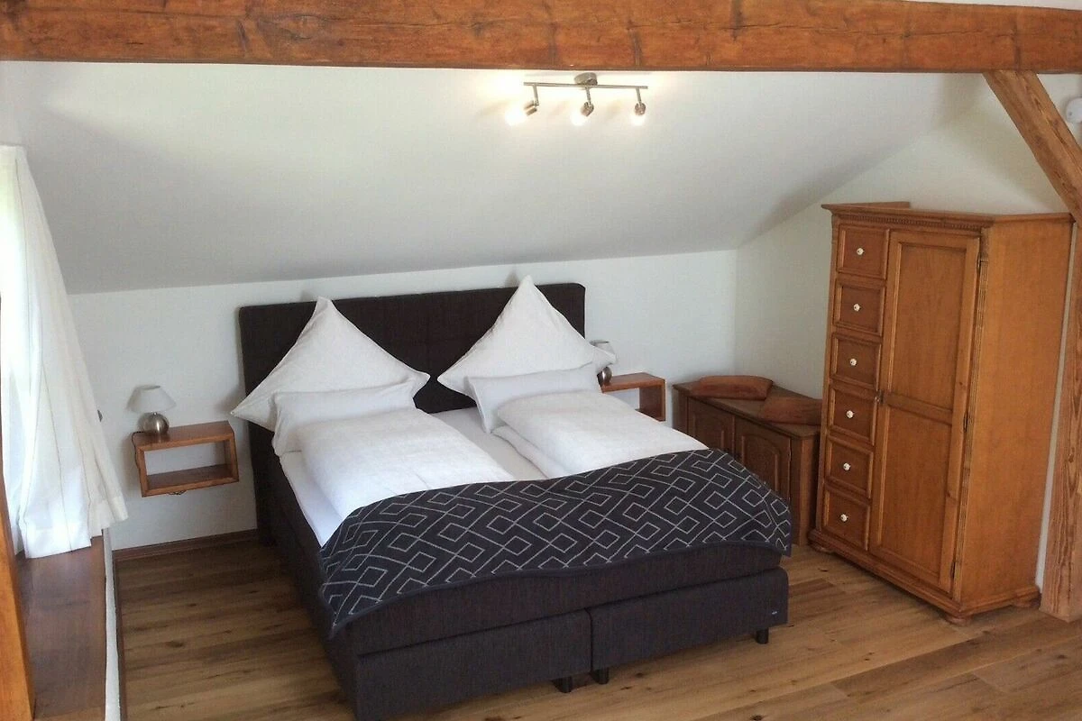 Das Schlafzimmer mit Parkettfussboden enthält ein Boxspringbett ( 2 x 2 m) sowie eine ausziehbare Doppelschlafcouch zum Aufbetten. Zusätzlich hat die Wohnung einen modernen Ferseher, eine eigene Gegensprechanlage und WLAN-Zugang.