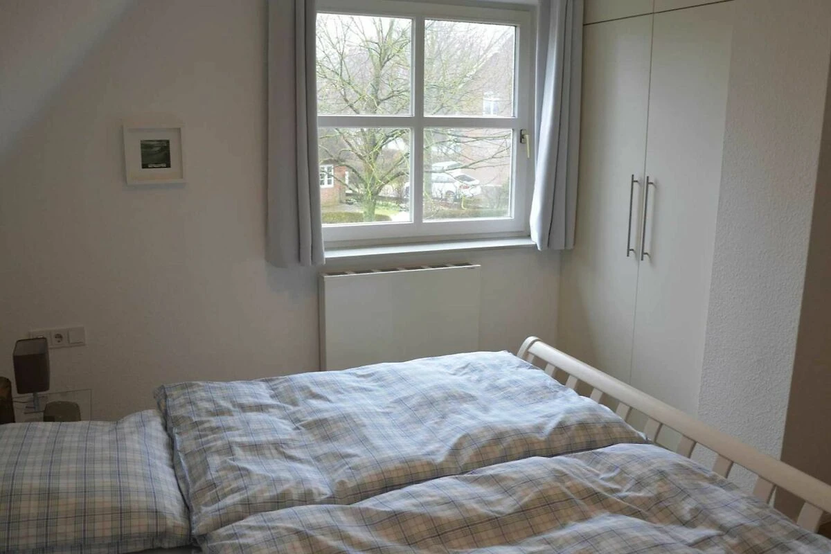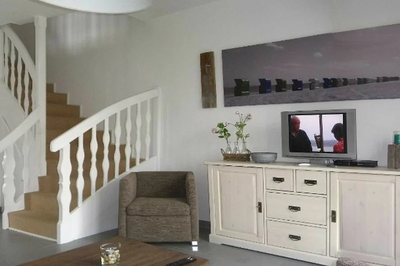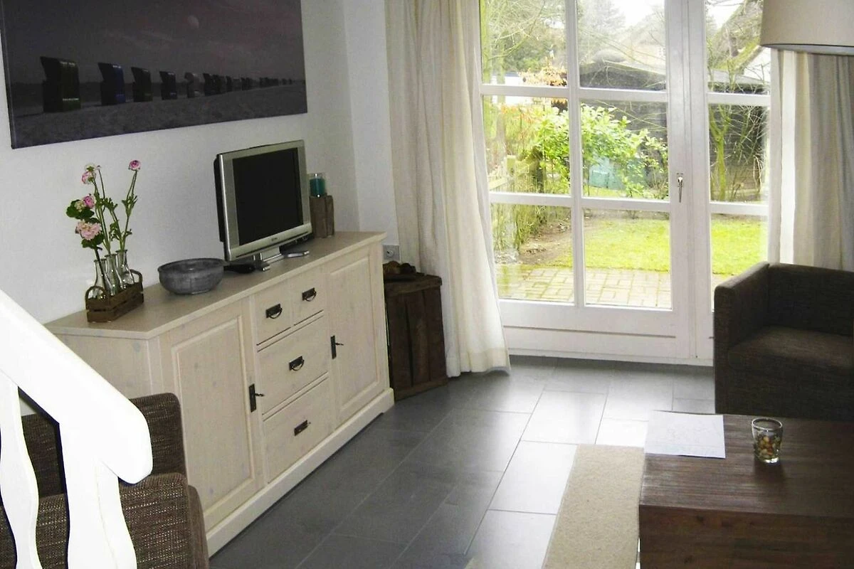 Küche mit Esstisch , Wohnbereich mit Zugang zur Terrasse und ein Gäste WC, einen separaten Eingang sowie einen eigenen Garten.Im Sommer wie auch im Winter können Sie sich in unserem Haus wohlfühlen. Die Fussbodenheizung und der offene Kamin sorgen für eine gemütliche Atmospähre.Nieblum ist das schönste Dorf der Insel. Den historischen Ortskern erreichen Sie in 3 Minuten und zum Strand gehen Sie gemütlich ca. 10 Min.