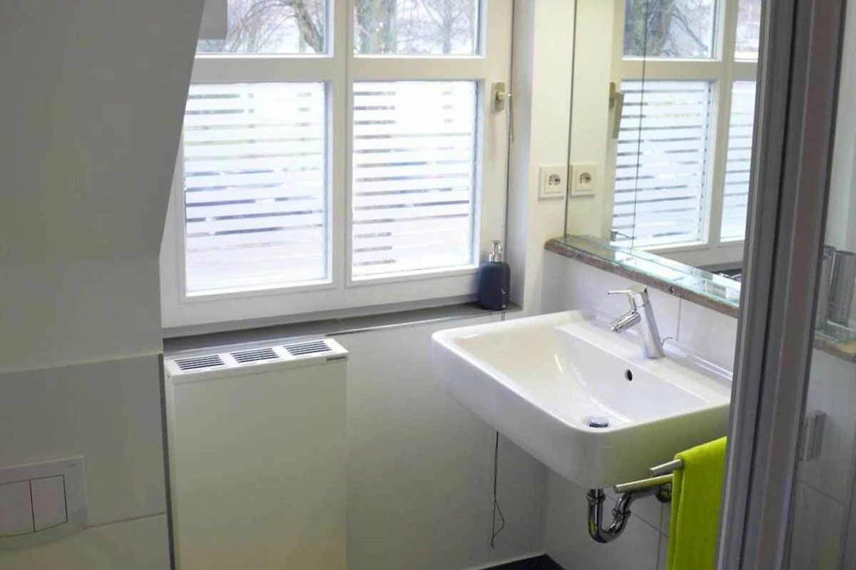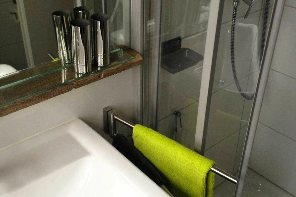 Sanitär: bodenebene Dusche, Föhn, Handtuchheizkörper, Schminkspiegel.