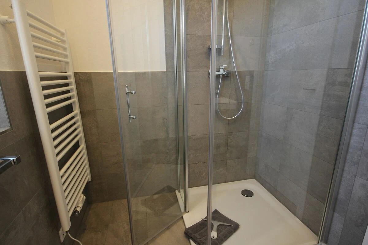 Das Bad, mit der ebenerdiger Dusche sowie Haarföhn, runden die Einrichtung ab.