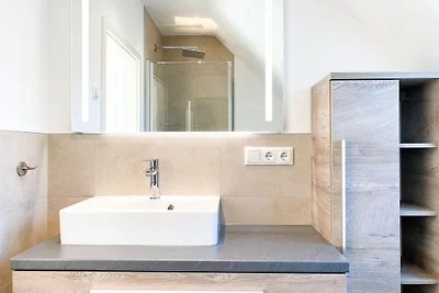 • Badezimmer: Zwei moderne Bäder mit bodengleichen Regenduschen, Handtuchheizkörpern und Abluftanlagen.