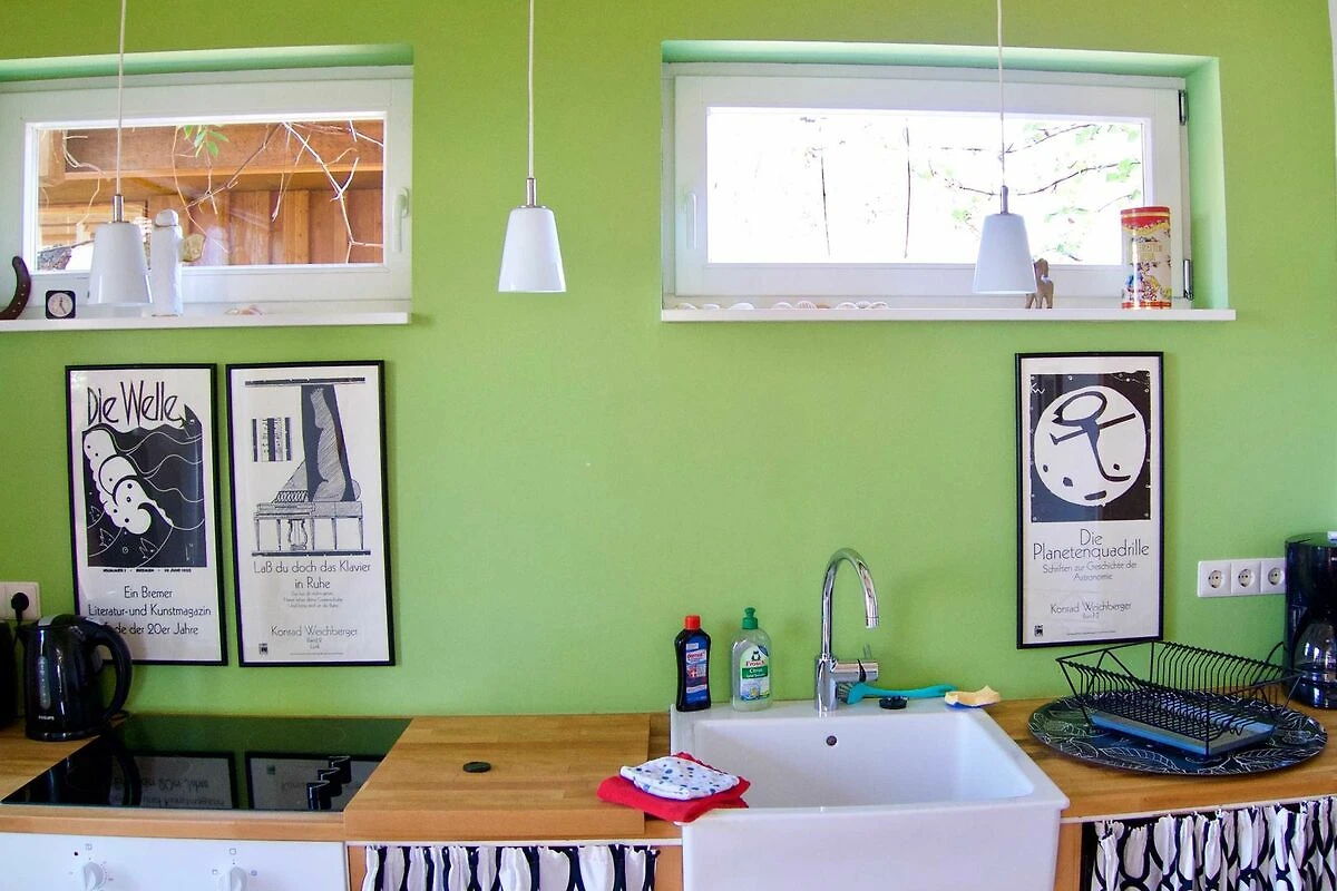 Das Haus wurde 2009 errichtet und wird seit Januar 2012 als Ferienhaus genutzt. Bei einer Wohnfläche von 50qm bietet es Platz für zwei Personen. Der schöne Holzfussboden, grosse Pflanzen sowie hohe Fensterfronten geben dem Haus eine behagliche, warme und helle Atmosphäre. Es ist individuell und modern eingerichtet. An den Wänden hängen Bilder des Worpsweder Malers Tobias Weichberger. Weiterhin befindet sich im Haus ein Fernseher mit DVD-Player und Sie haben Internetzugang. Ökologische und hochwertige Baustoffe sorgen für ein gesundes Raum- und Lebensklima. Der kleine Schlafraum verfügt über zwei Einzelbetten, die zum Doppelbett zusammengestellt werden können. Es gibt eine Küche, ein geräumiges Bad und einen grosszügigen Wohnraum. Die daran angrenzende Holz-Terrasse unter grossen und hohen Kastanienbäumen bietet Gelegenheit, um draussen zu verweilen. Das Haus wurde vom Deutschen Tourismusverband e.V. mit drei Sternen ausgezeichnet.