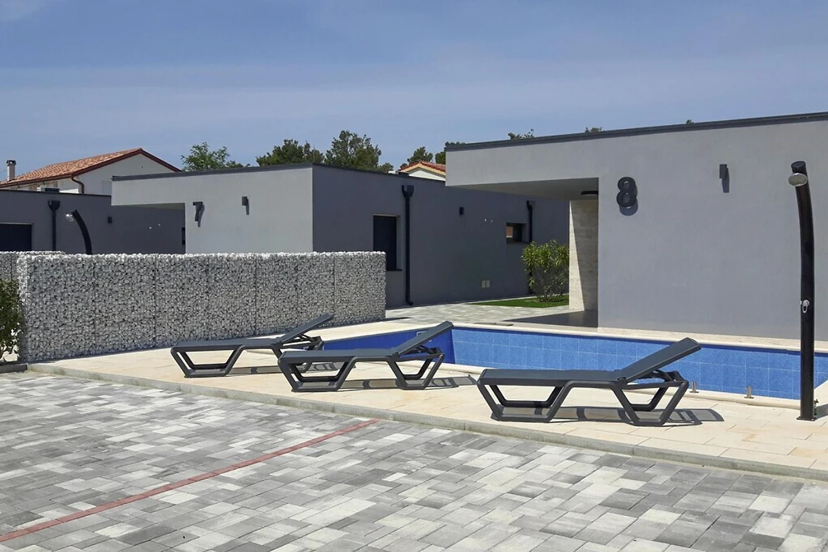 Die neu erbaute kleine Villen-Anlage liegt nahe dem Zentrum und dem Kiesstrand Jadro im Hauptort Vir auf der gleichnamigen Insel Vir. Insgesamt acht moderne Villen mit jeweils einem eigenen Privatpool sorgen für einen entspannten Aufenthalt. Im Rezeptionsgebäude stehen darüber hinaus kostenlos Fitnessraum, automatische Massagebank sowie Sauna und Jacuzzi zur Verfügung. Ein Sport- und Spielplatz für Kinder sowie Basketball-, Fußball- und Badmintonplatz sind ebenfalls im Preis inklusive - da kommt keine Langeweile auf! Beim Bau der Anlage wurde besonders viel Wert auf Sicherheit und Privatsphäre gelegt und das gesamte 4.400 Quadratmeter große Areal ist ummauert. Jede Villa hat rund 350 qm zur Verfügung - mit Sichtschutz zum Nachbarn. Die Anlage ist mit insgesamt 8 Villen auch gut für Gruppen geeignet (Gruppenrabatt auf Anfrage). Der Vermieter betreibt darüber hinaus ein beliebtes Restaurant, das nur 1,5 Kilometer entfernt ist. Hier gibt es auch die Möglichkeit für Frühstück (etwa 10 € p.P.) und Halbpension (etwa 24 € p.P.). Darüber hinaus erhalten Sie als Gast der Villen 15% Rabatt auf alle a la Carte Speisen im Restaurant Ibiza und können bei einem köstlichen Mahl auf der Terrasse den Blick auf das Meer genießen.