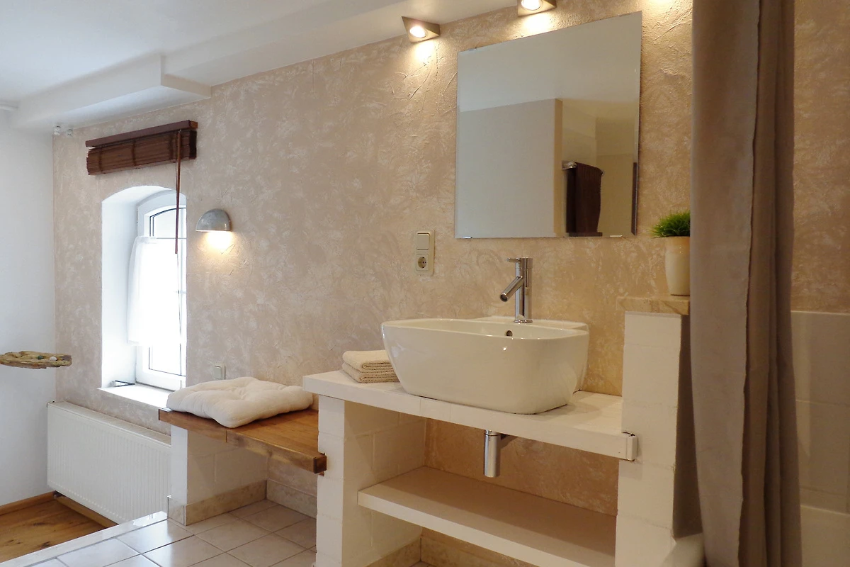Das Badezimmer ist mit Dusche (Höhe: ca. 1,80 m), Waschtisch und WC ausgestattet. Im Sommer herrscht auch bei hohen Außentemperaturen ein angenehmes Raumklima in der Ferienwohnung. Die Wohnung ist nicht barrierefrei.