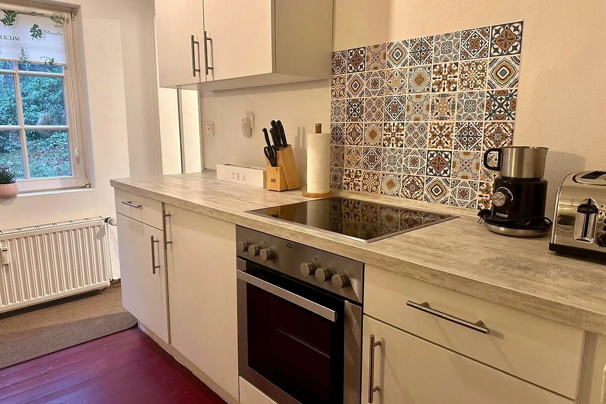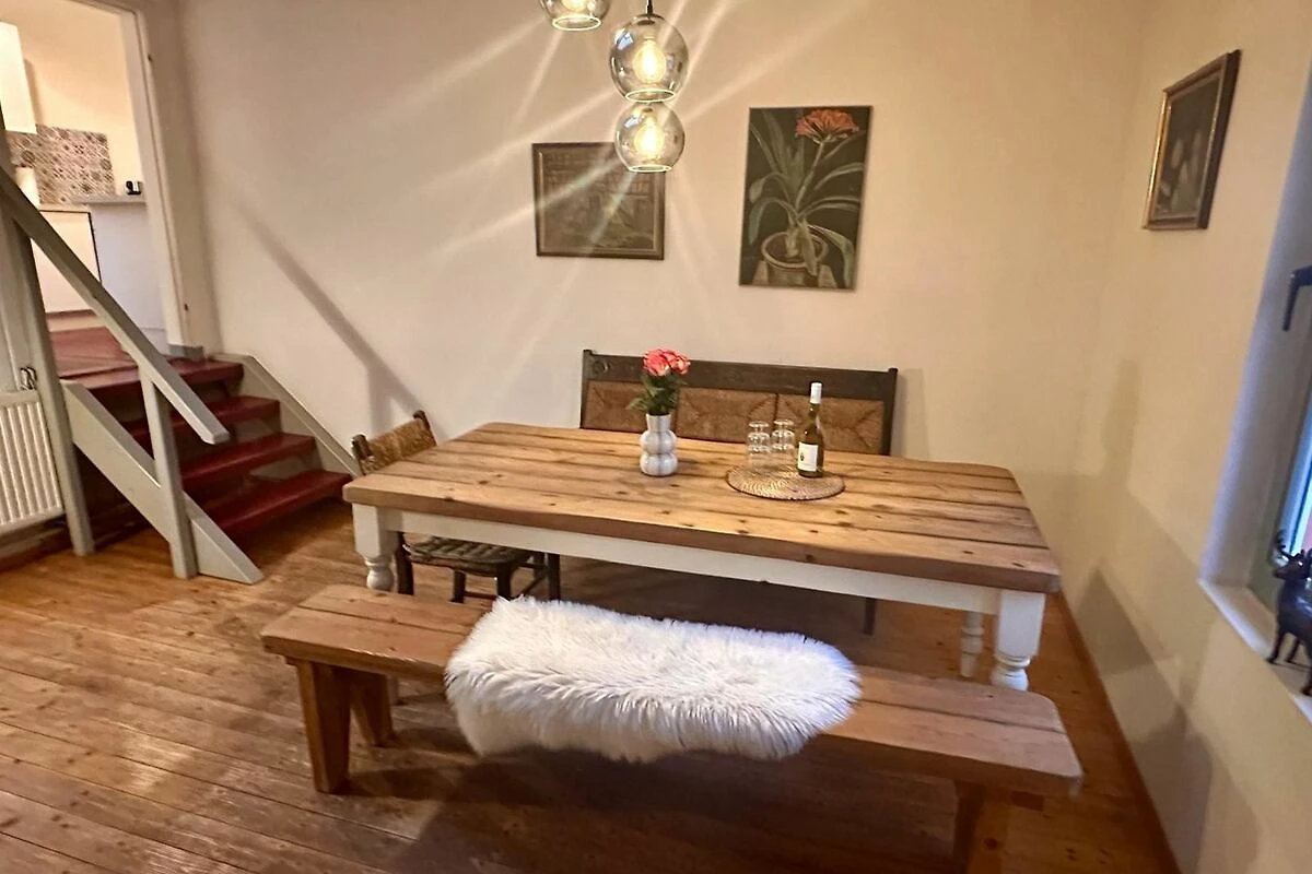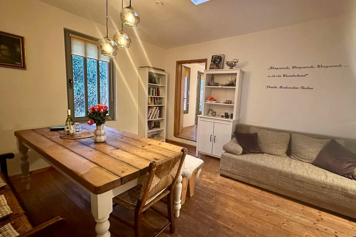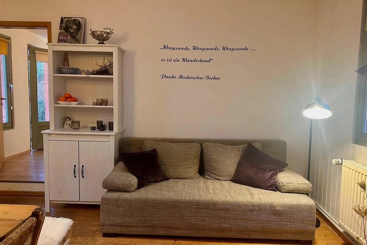 3 Zimmer-Wohnung, 86 m2, Erdgeschoss, geräumig und hell, 2013 vollständig renoviert, modern und geschmackvoll, u.a. mit Worpsweder Antiquitäten und Bildern eingerichtet: sehr gr. helles Wohnzimmer mit gemütlicher Sitzecke, Fliesenboden, 2 komf. Schlafcouches, Flachbild-TV, Stereoanlage/DVD. Gemütliches Schlafzimmer mit komf. Boxspring Bett (160 cm, Länge 190 cm), Dachfenster. Küche imt Einbaugeräten (4 Kochplatten, Backofen, Geschirrspüler, Kühlschrank) komplett ausgestattet, sep. Esszimmer mit Esstisch, Sitzecke, Dielenboden. Dusche/WC. Gasheizung und Kaminofen.