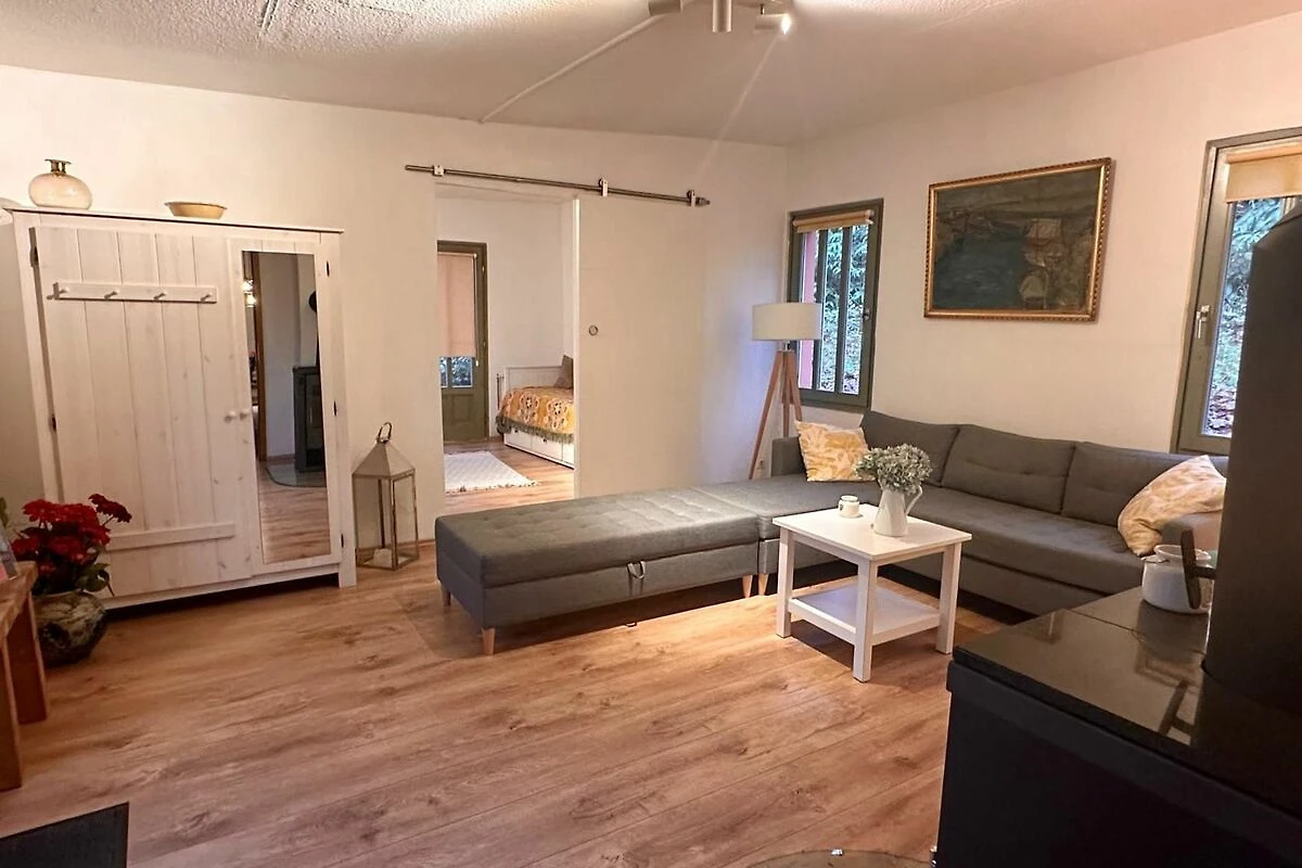 Wohnzimmer mit gemütlicher Sitzecke, und Kaminofen, Flachbild-TV, Stereoanlage/DVD.