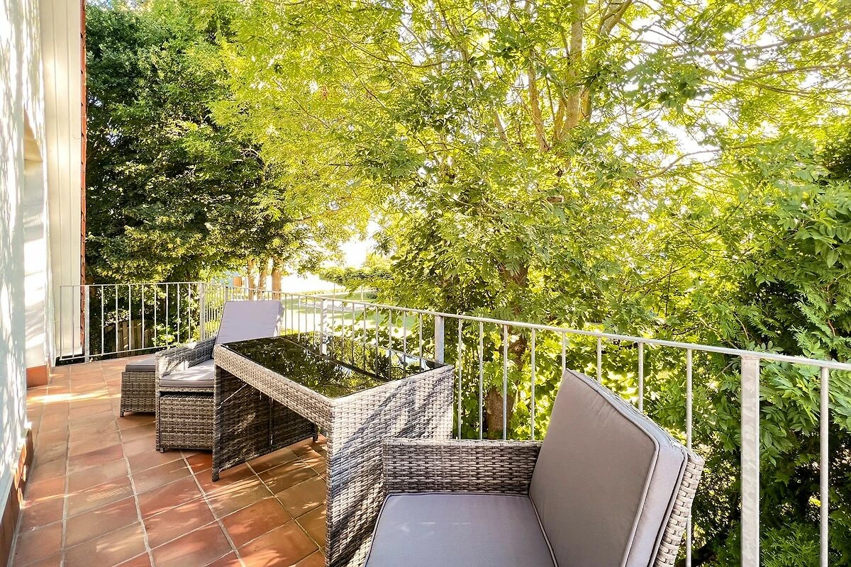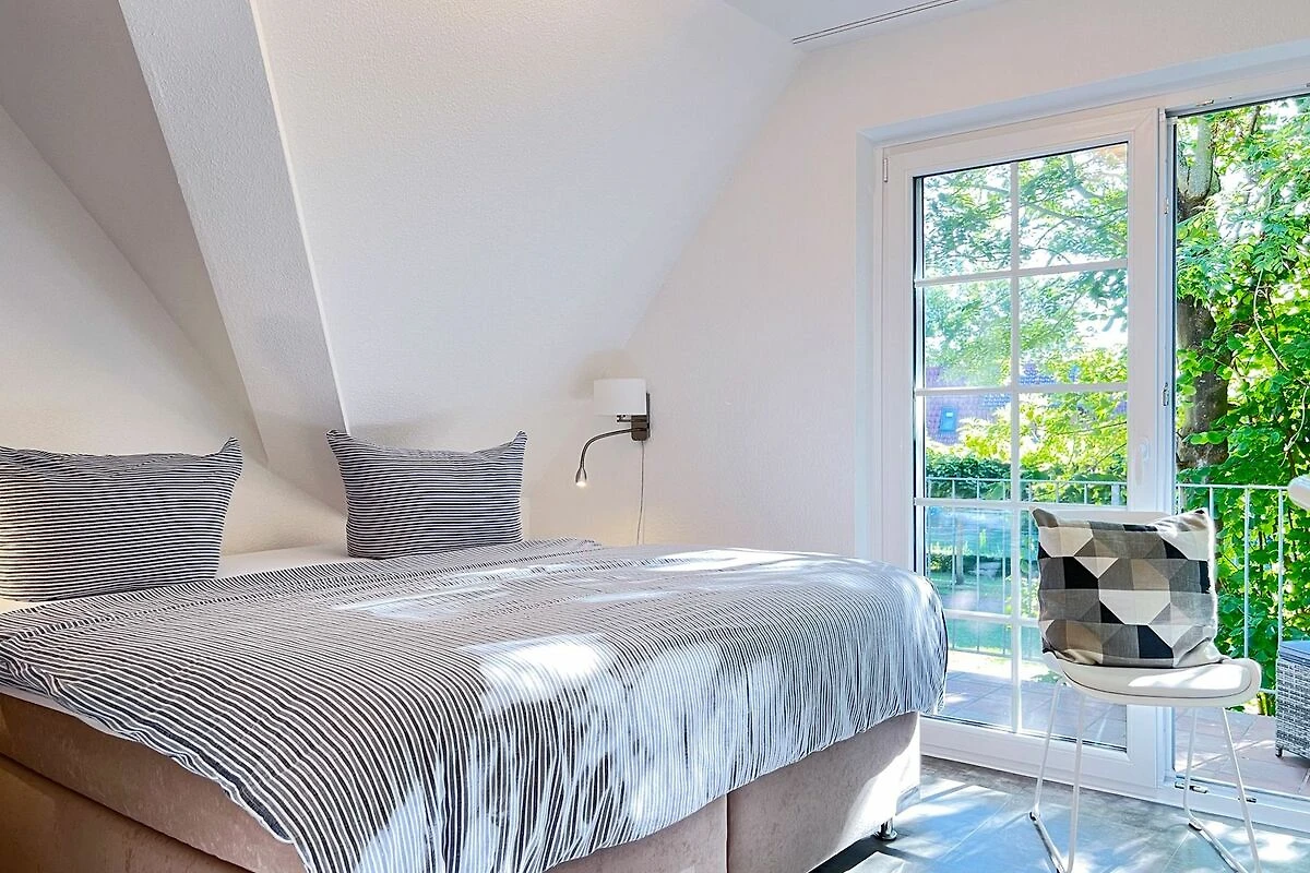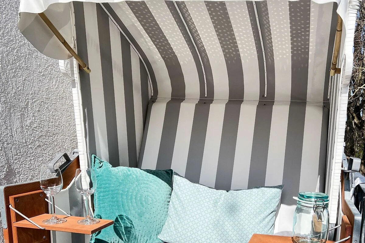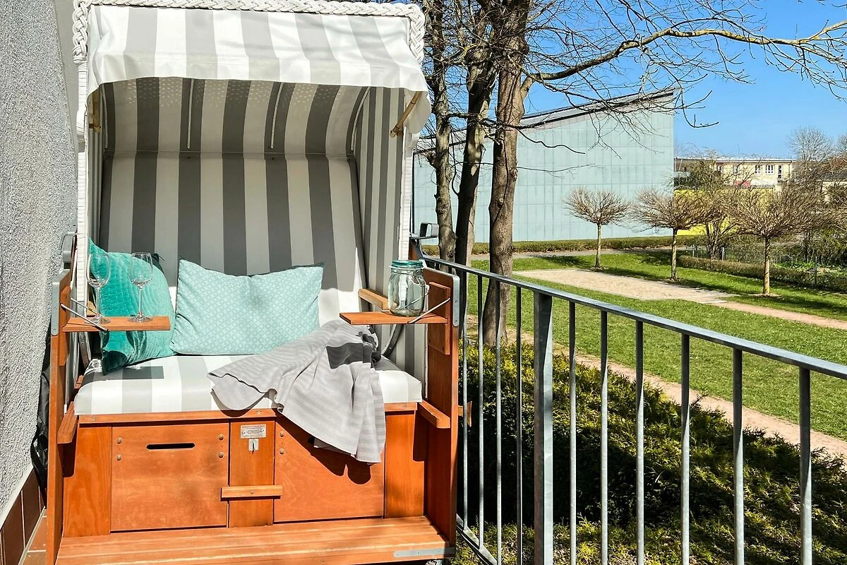• Balkon: Grosszügiger Balkon mit gemütlichem Strandkorb und grünem Sichtschutz, ideal zum Entspannen.